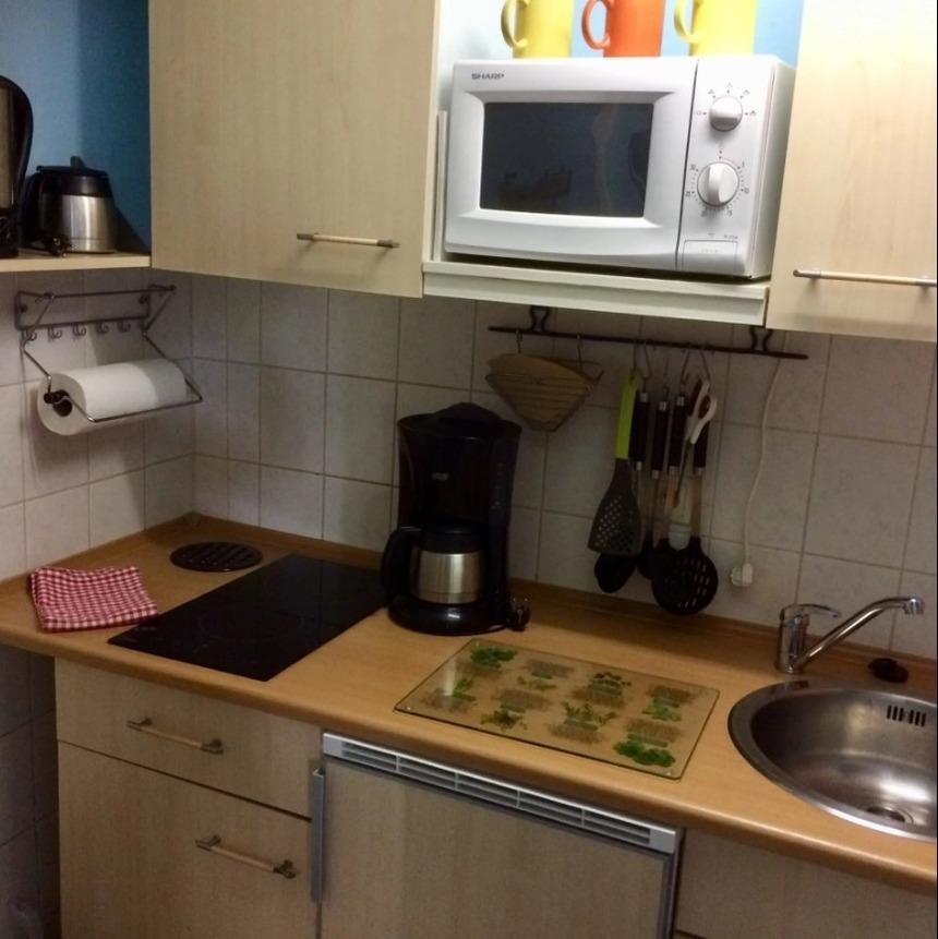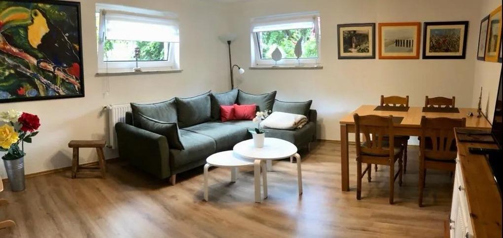 Die Ferienwohnung ist etwa 45qm groß und besteht aus einem Wohnzimmer mit Schlafcouch,TV-Flachbildschirm und Radio. Ein gefüllter Bücherschrank und Spiele sind ebenfalls vorhanden. Ein gemütlicher Essplatz für 4 Personen komplettiert das Zimmer.