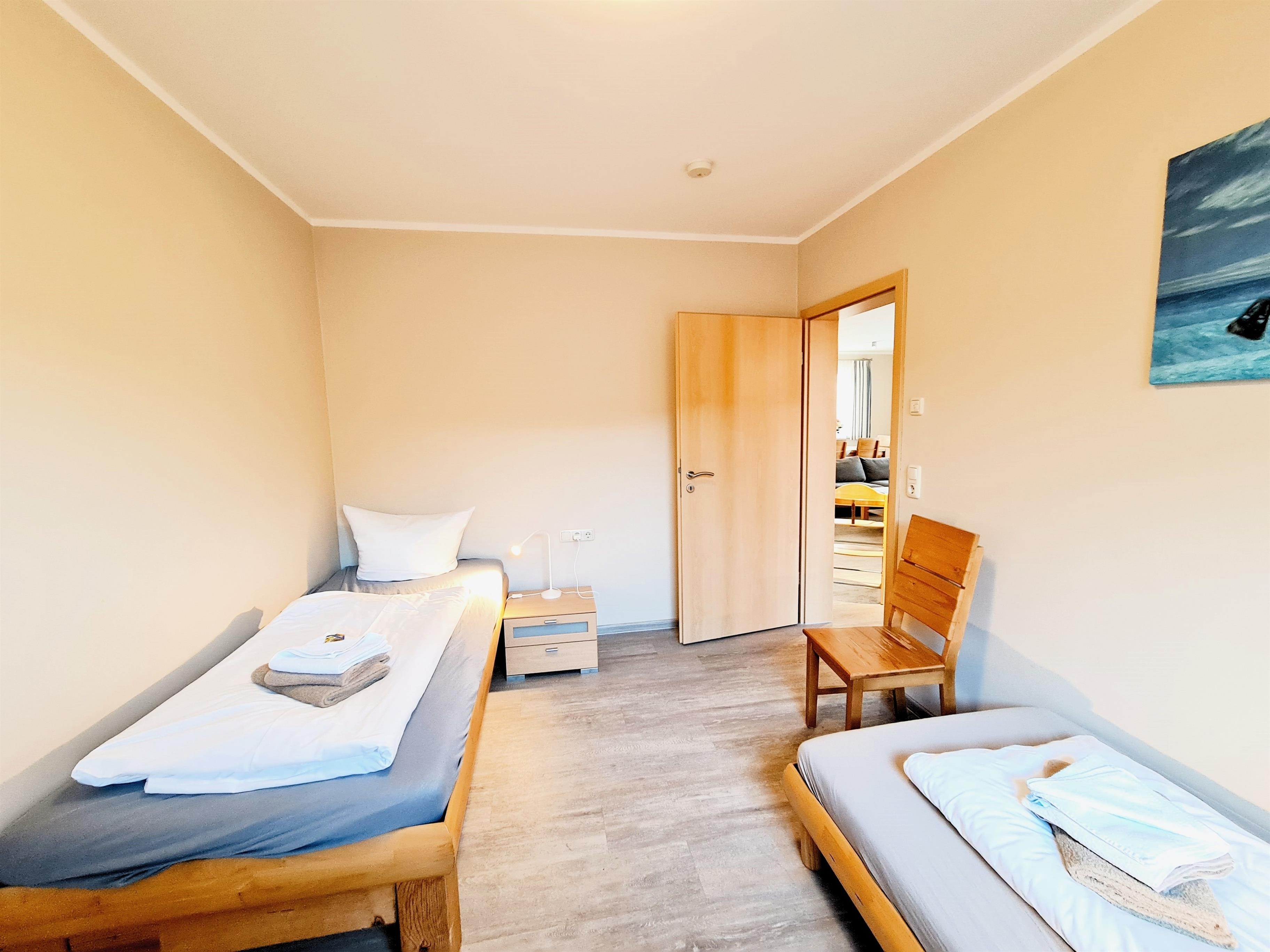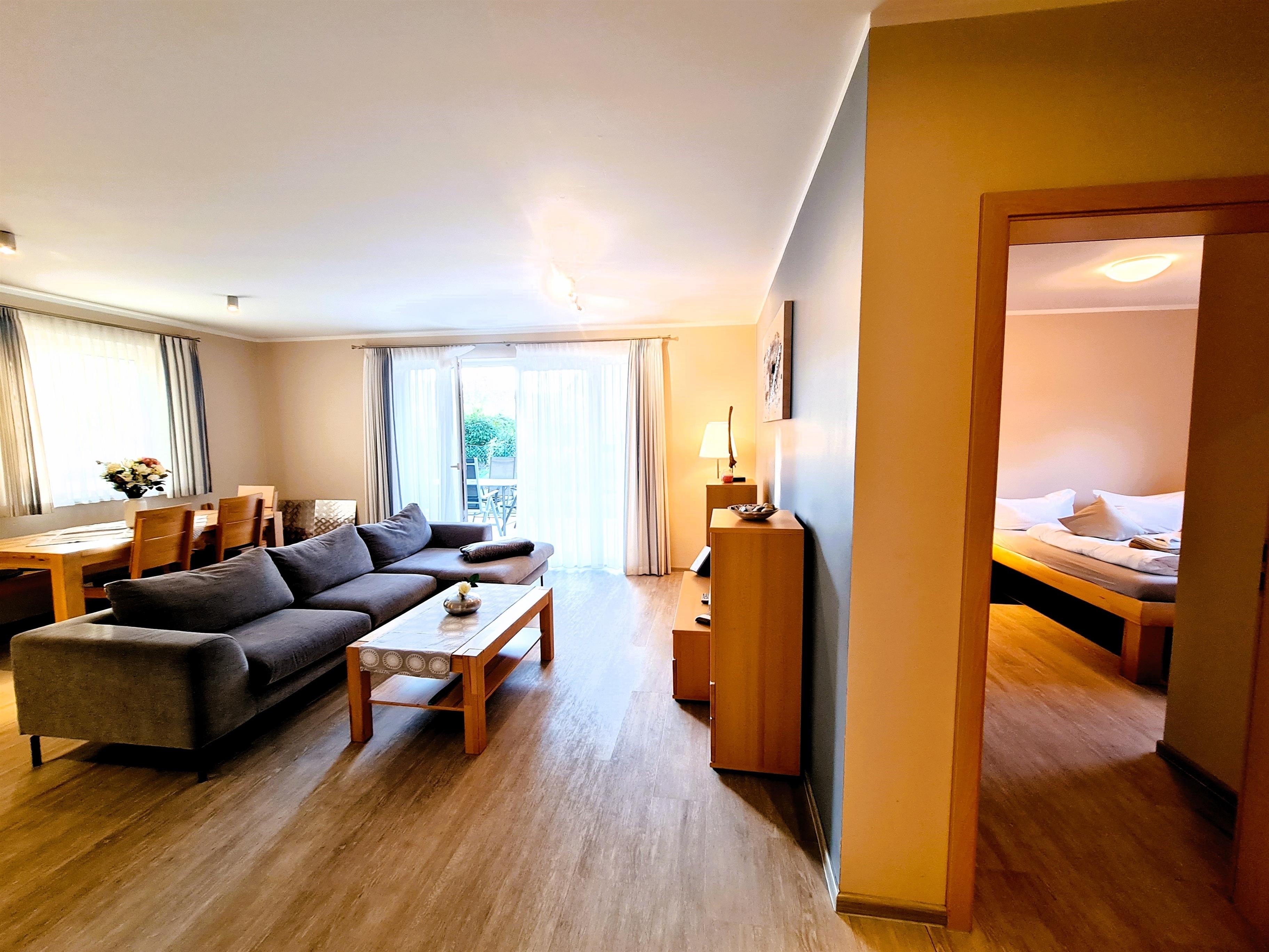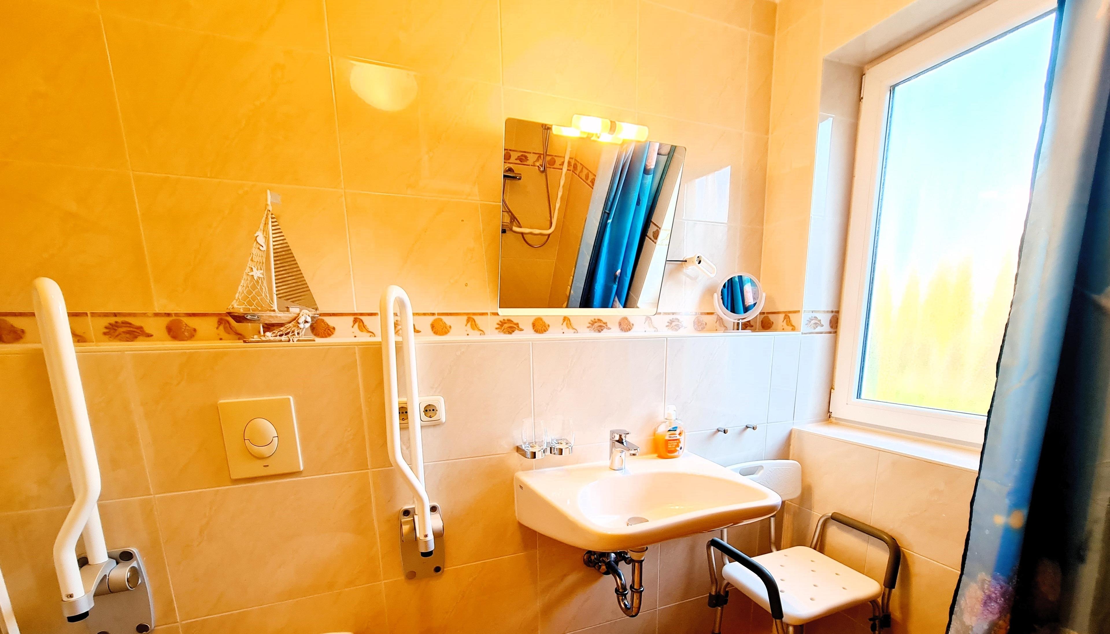Die Wohnung 1 im Erdgeschoss ist sehr liebevoll, mit Blick für das Detail eingerichtet. Die Wohnung ist rollstuhlfreundlich und verfügt über 2 Schlafzimmer, einen großzügigen Wohn-, Koch- und Essbereich, einem rollstuhlgerechten Bad mit Dusche, einem Gäste-WC mit Waschmaschine, einer Terrasse mit anschließendem Garten.