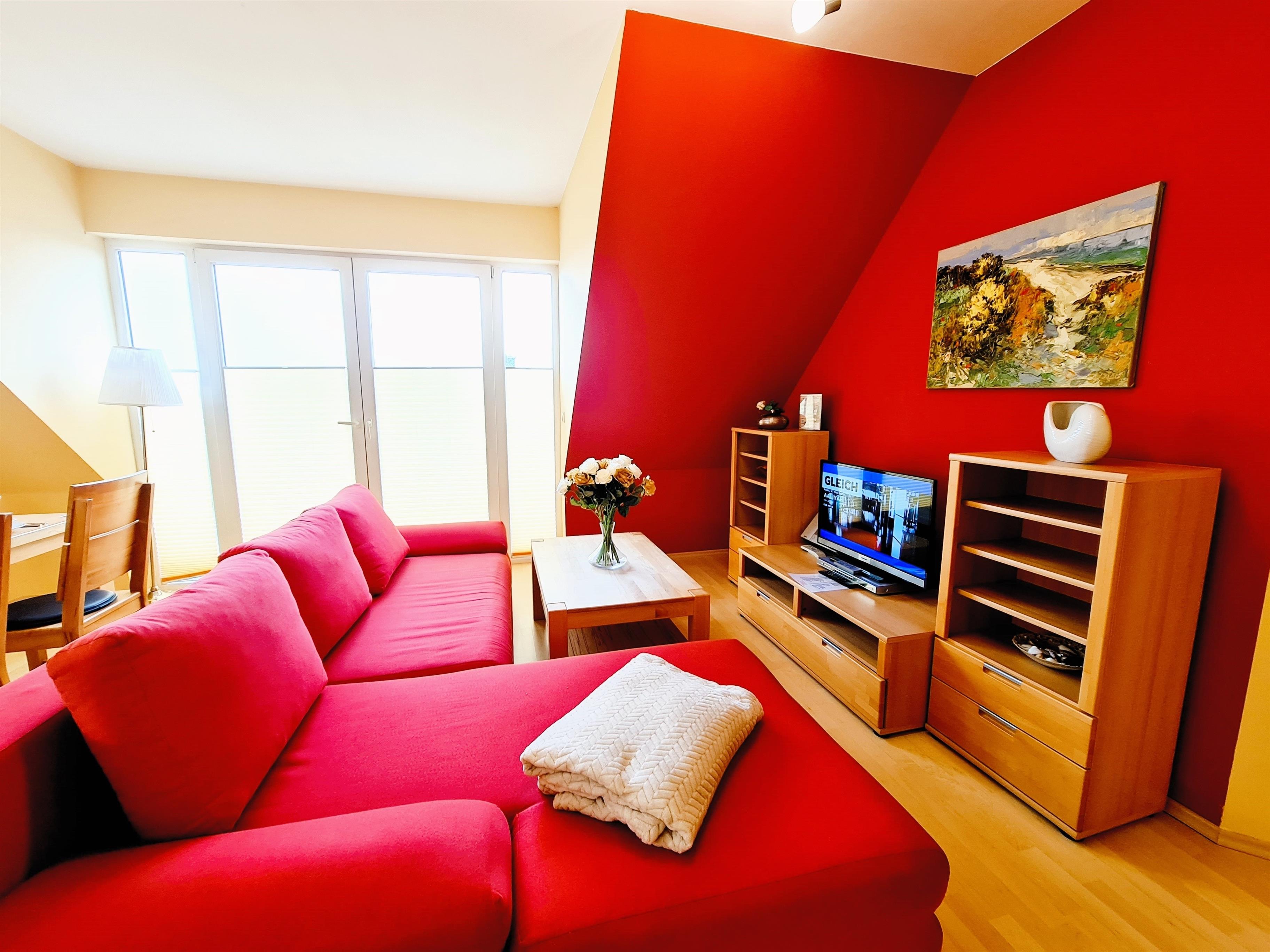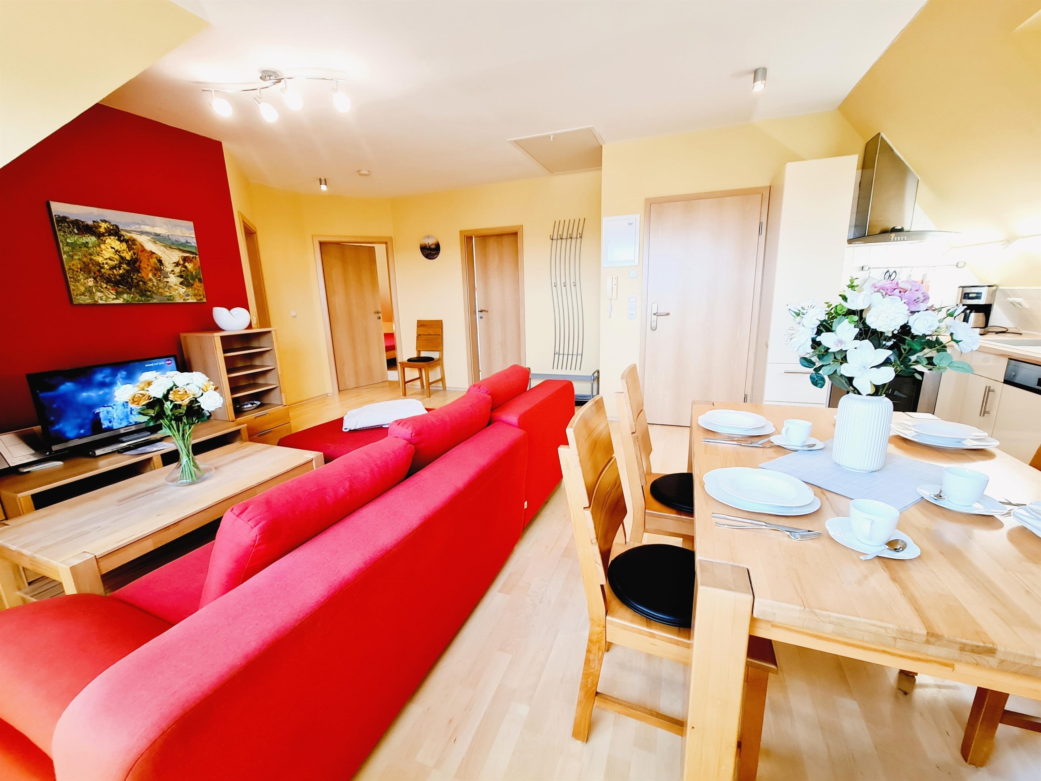 Die Wohnung 3 im Dachgeschoss ist sehr liebevoll, mit Blick für das Detail eingerichtet. Die Wohnung verfügt über 2 Schlafzimmer, einen großzügigen Wohn-, Koch- und Essbereich, einem Bad mit Dusche und Waschmaschine, einem großzügigen Balkon zur Südseite.
