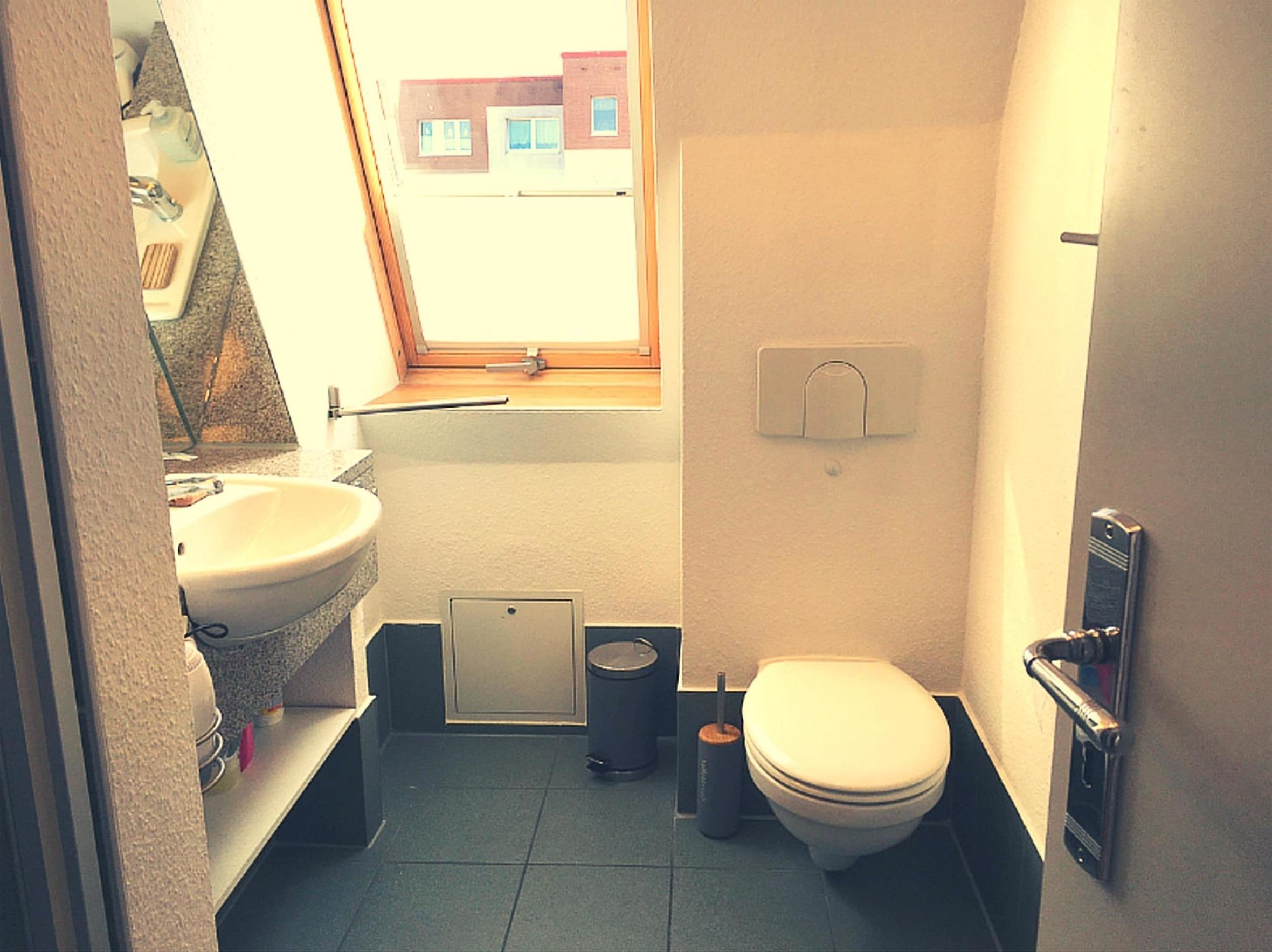 Das Duschbad erhält durch das Dachfenster viel Tageslicht und bietet ein großes Waschbecken mit viel Ablagefläche .