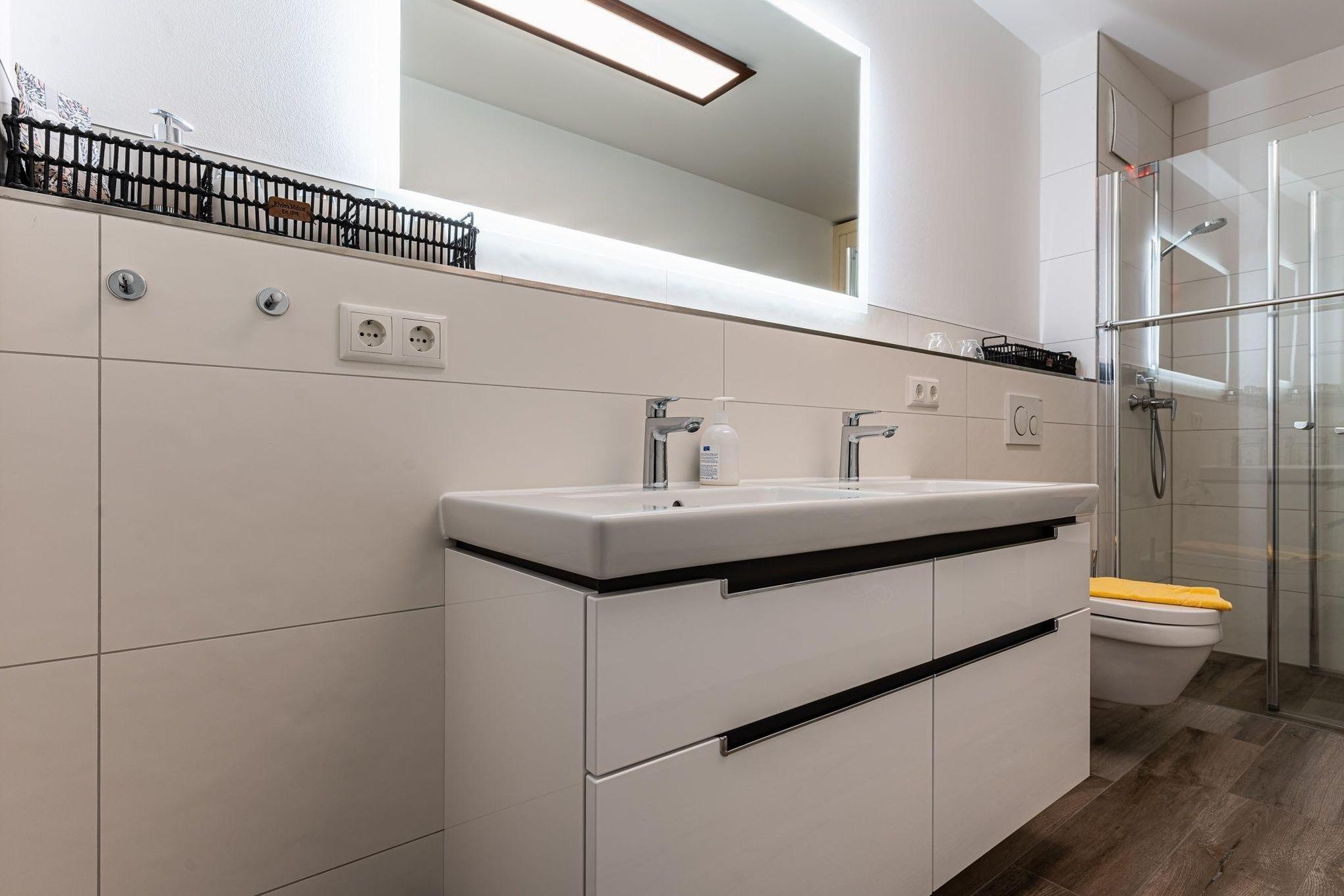 Das Bad verfügt über eine begehbare Dusche. Ein moderner Waschtisch mit genügend Ablagemöglichkeiten für Ihre Utensilien, ein großer Spiegel und ein Föhn sind vorhanden. Ein Highlight ist Ihre private Sauna, welche Sie uneingeschränkt nutzen können.