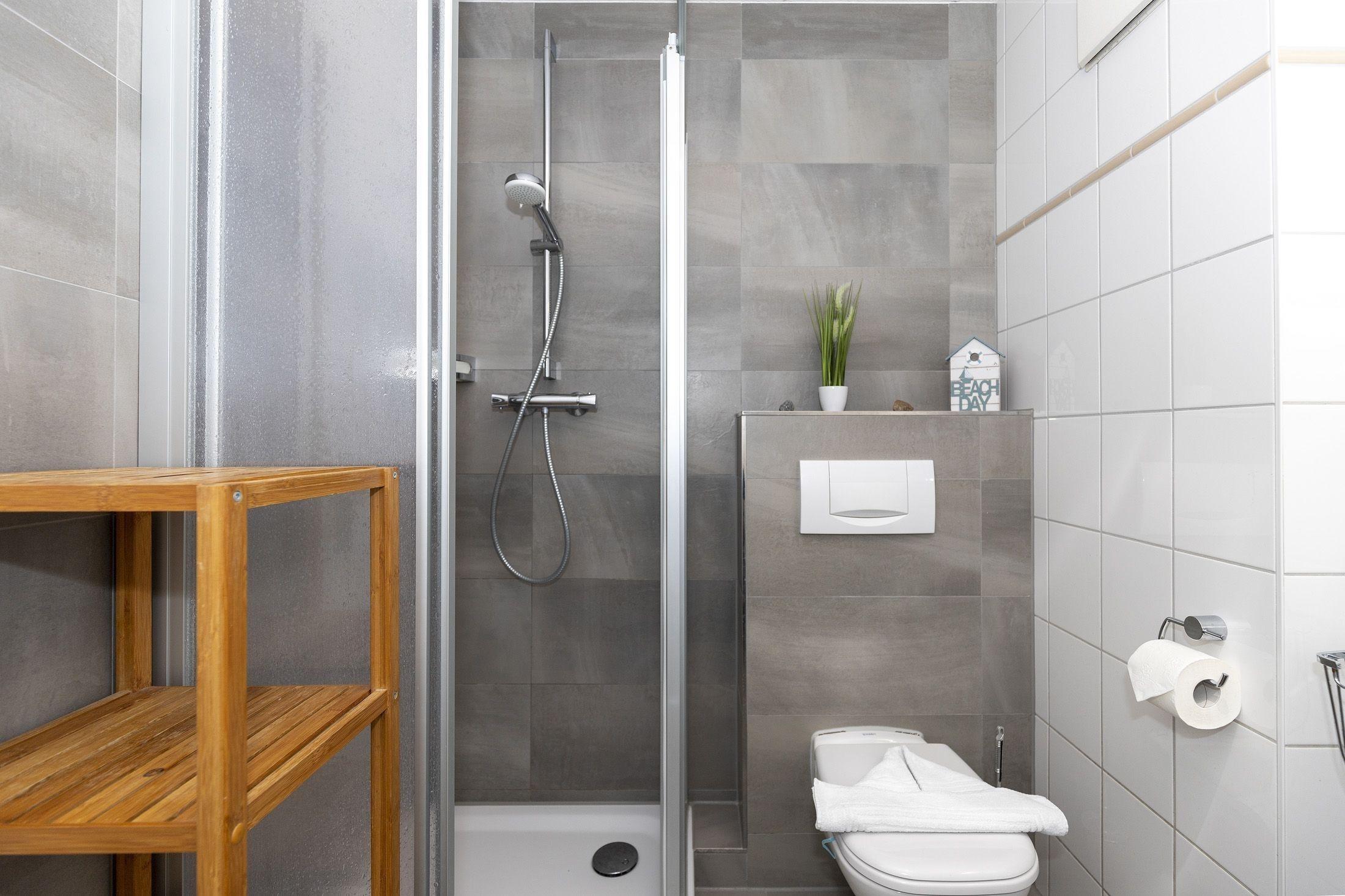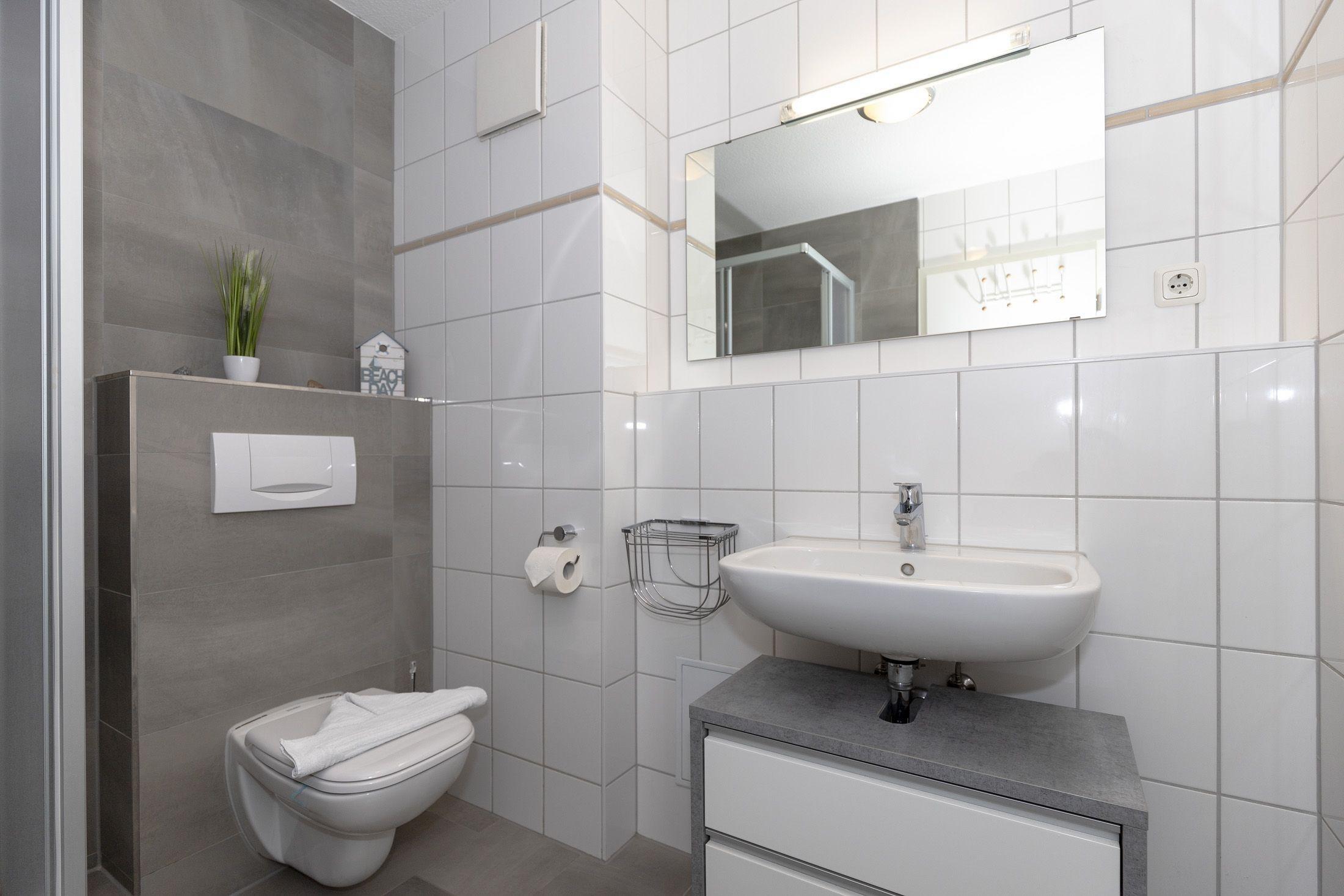 Das Badezimmer ist mit einer Dusche, einem WC und einem Waschbecken mit Unterschrank ausgestattet.