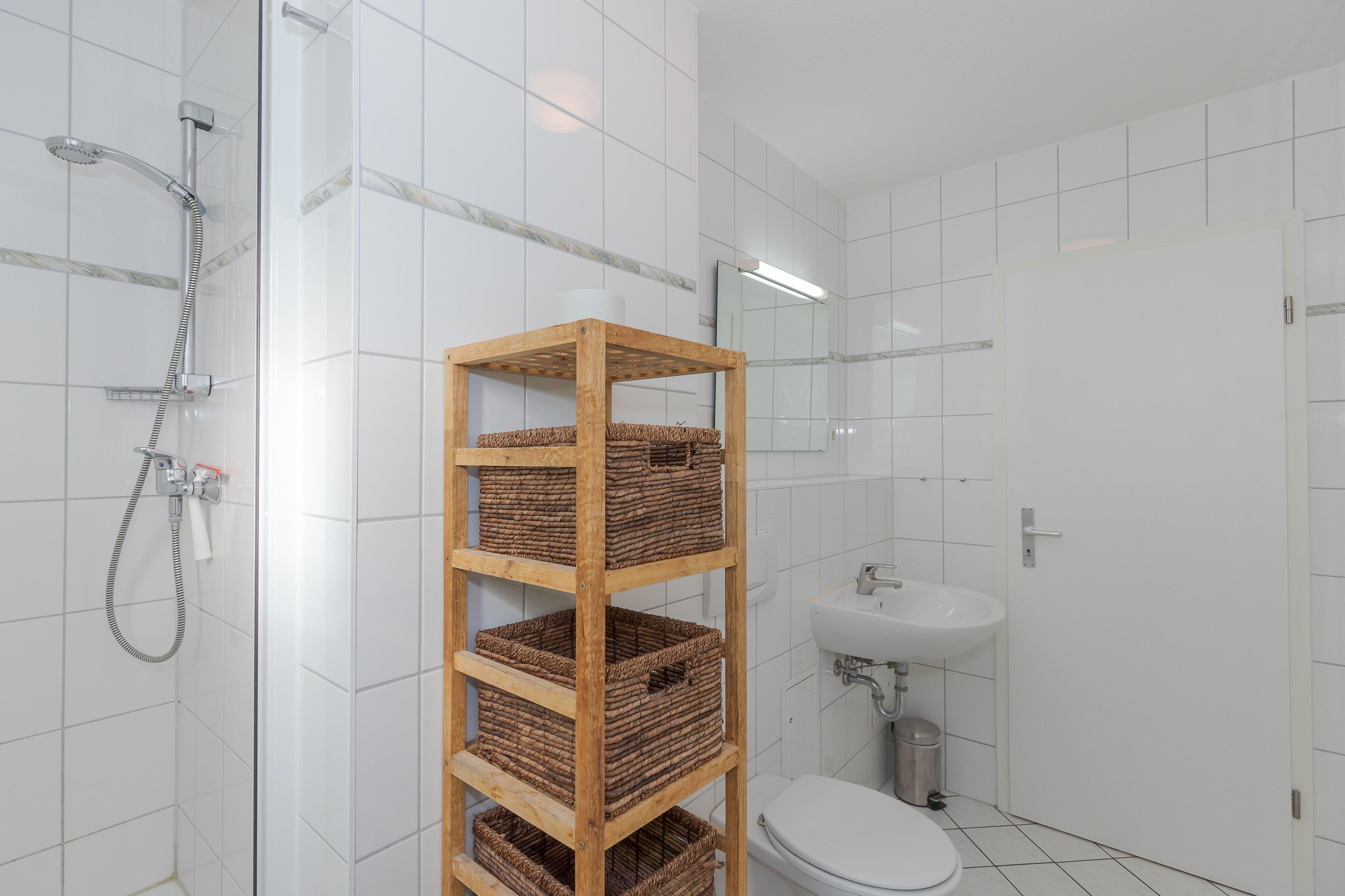 Das Badezimmer ist mit einer Dusche, einem Waschbecken, einem Handtuchheizkörper und einem WC ausgestattet.