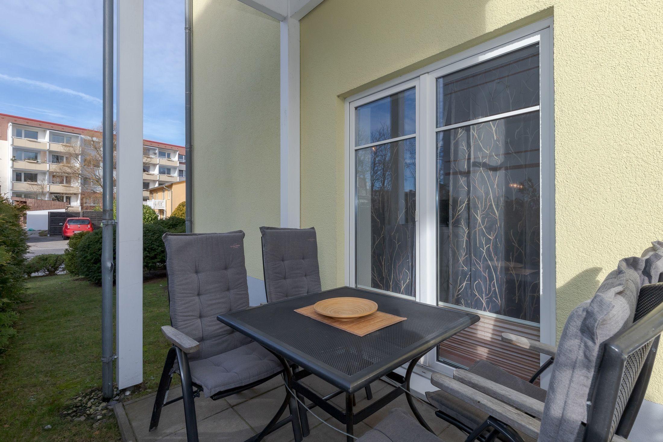 Die Terrasse ist vom Wohnzimmer aus zu erreichen und zur sonnigen Südseite gelegen. Hier genießen Sie Sonne satt. Es stehen Ihnen neue und bequeme Terrassenmöbel zur Verfügung.
