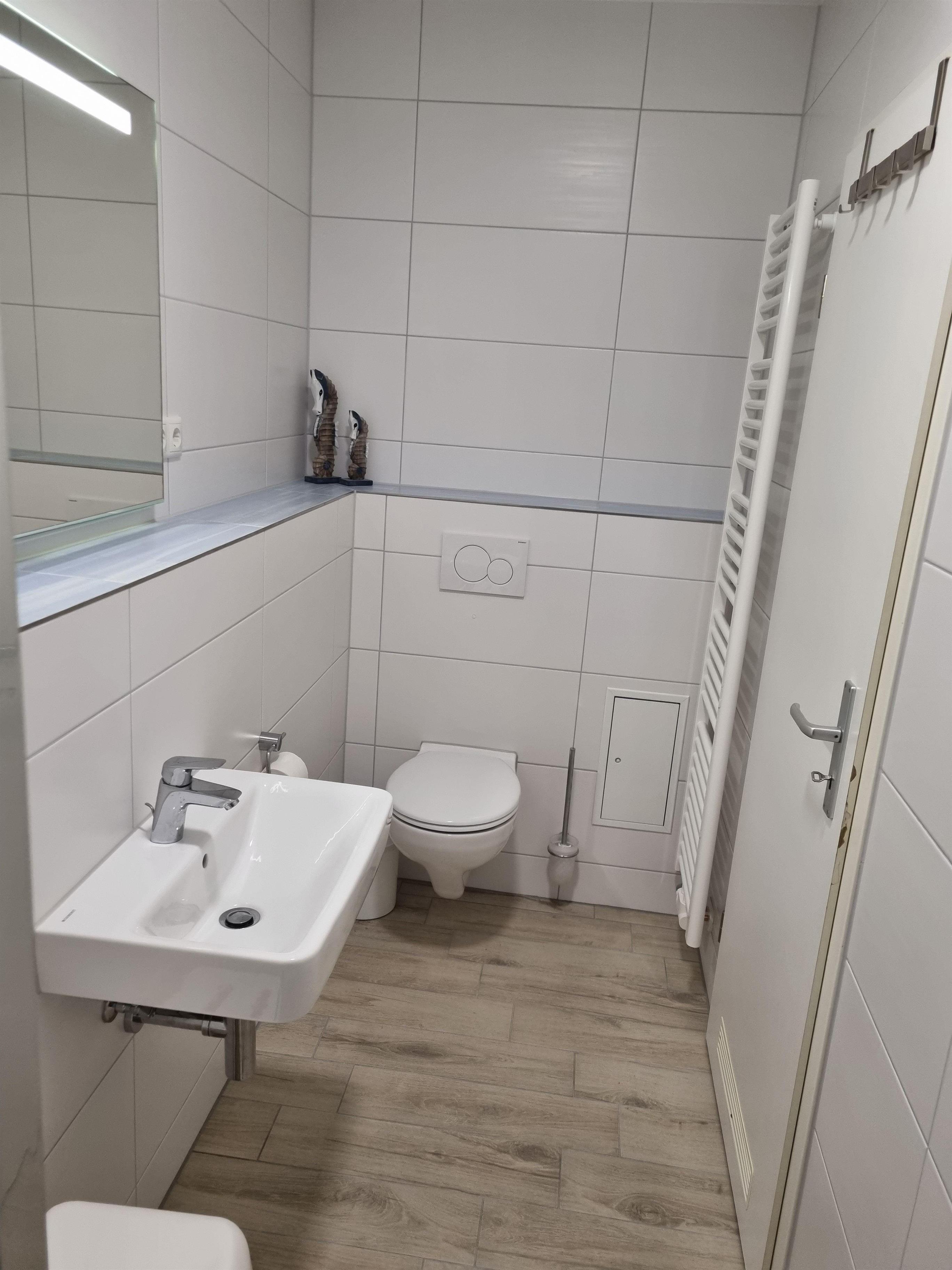 Das Badezimmer ist ausgestattet mit einer Dusche, einem WC, einem Waschbecken sowie ausreichend Ablageflächen für Ihre Badutensilien.