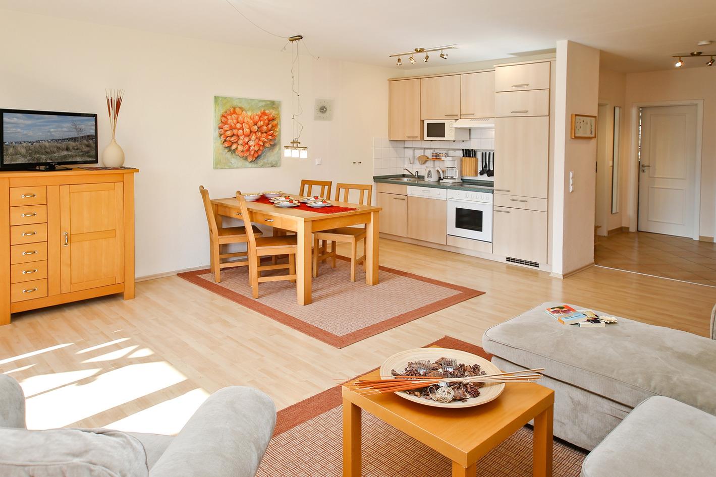 Die großzügige 3-Zimmer-Fewo befindet sich in Hochparterre. Die Wohnung ist ca. 60 m² groß und für bis zu 4 Personen eingerichtet. Im großen Schlafzimmer finden Sie ein Doppelbett (1,60 m breit, durchgehende Matratze). Das 2. Schlafzimmer ist mit einem Etagenbett ausgestattet. Der Wohnbereich verfügt über eine Sitzgruppe und Esstisch sowie eine Couch.