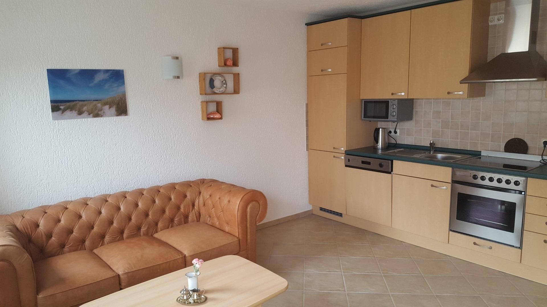 Die offene Küche ist bestens ausgestattet mit Backofen, Cerankochfeld, Geschirrspüler und Mikrowelle.