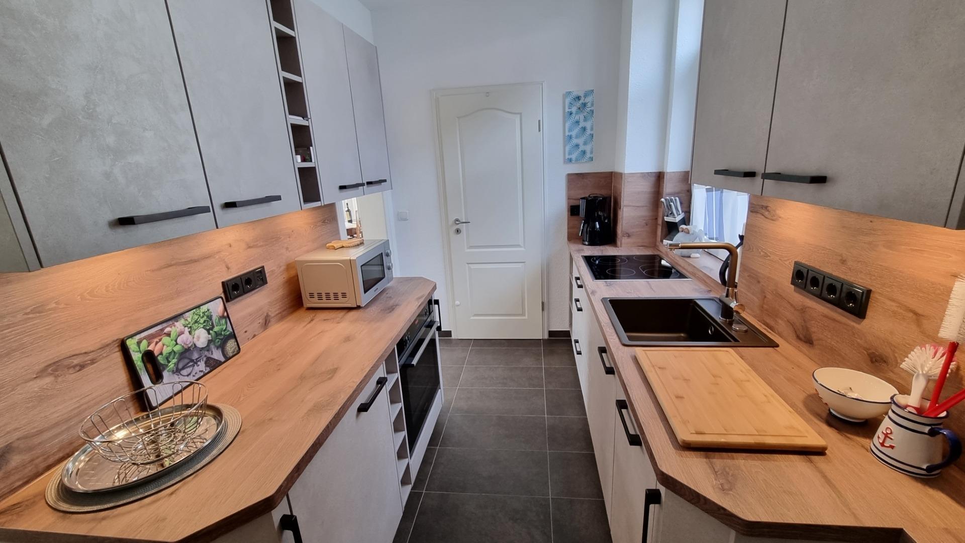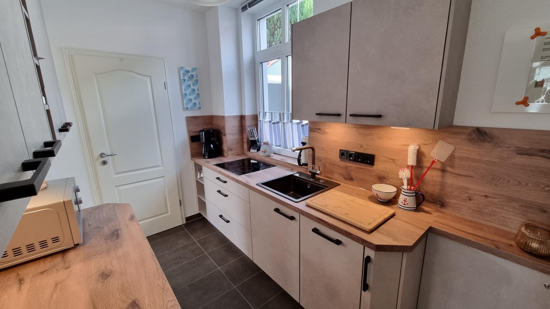 Die moderne Einbauküche mit Mikrowelle, Backofen und 4 Platten Ceranfeld befindet sich im Flurbereich.