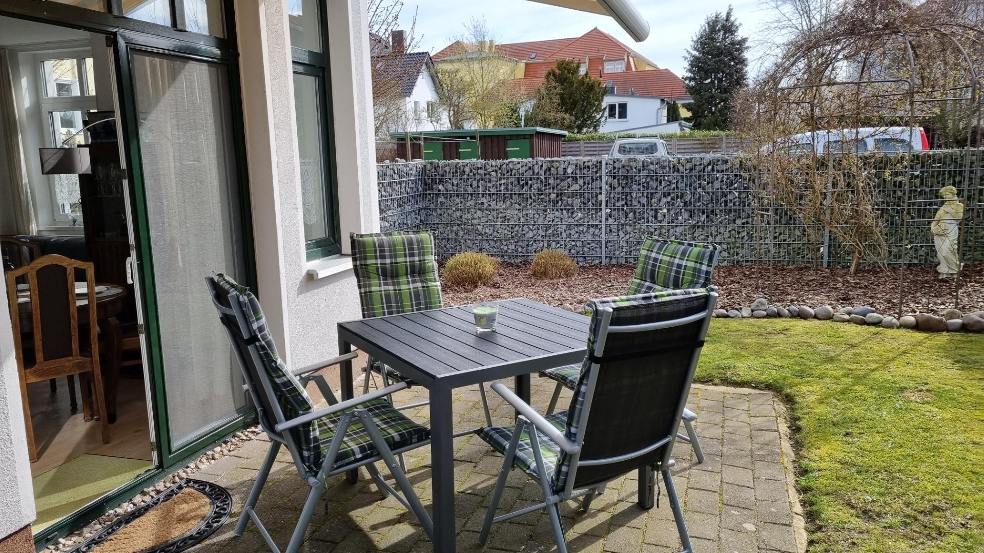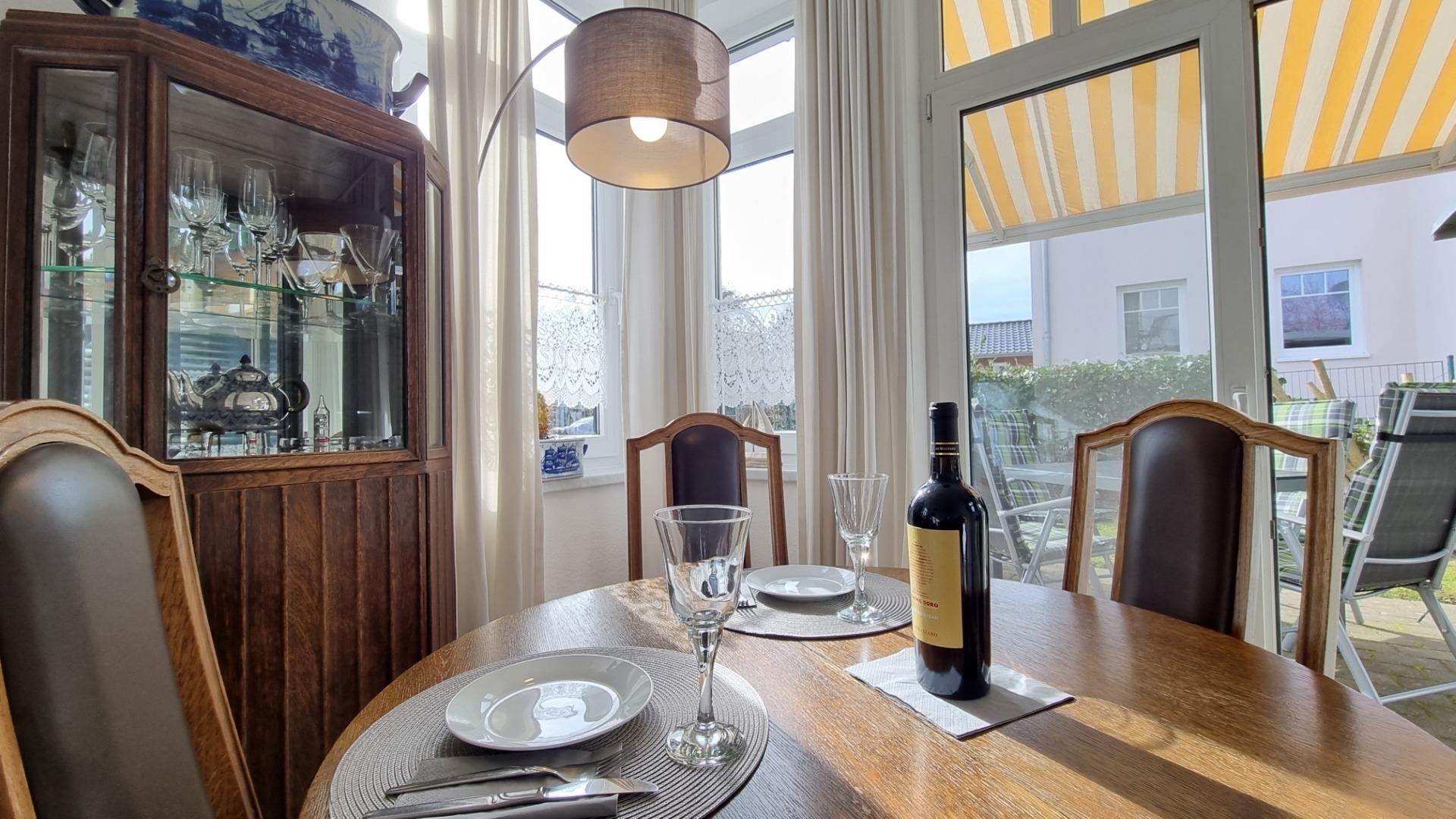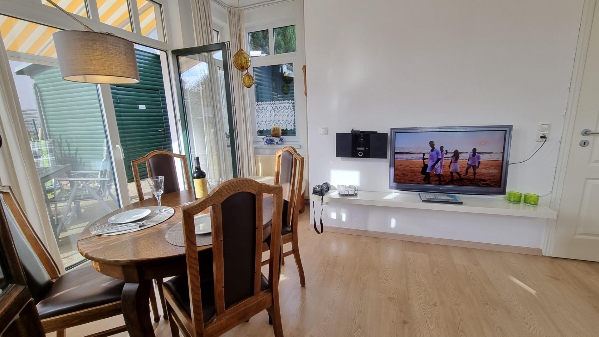 Der Wohnbereich mit Süd-Terrasse ist eingerichtet mit einer Sitzgruppe und Esstisch, das Schlafzimmer verfügt über ein Doppelbett.