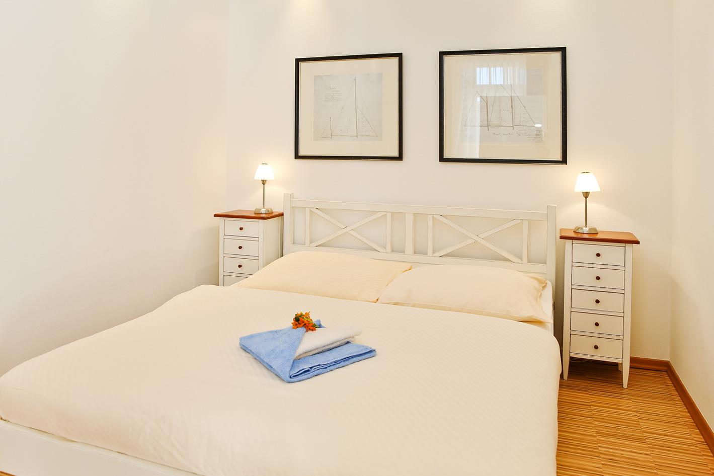 Ein Schlafzimmer bietet ein Doppelbett und 1 TV-Gerät, das zweite Schlafzimmer bietet ein weiteres Doppelbett zum Schlafen.