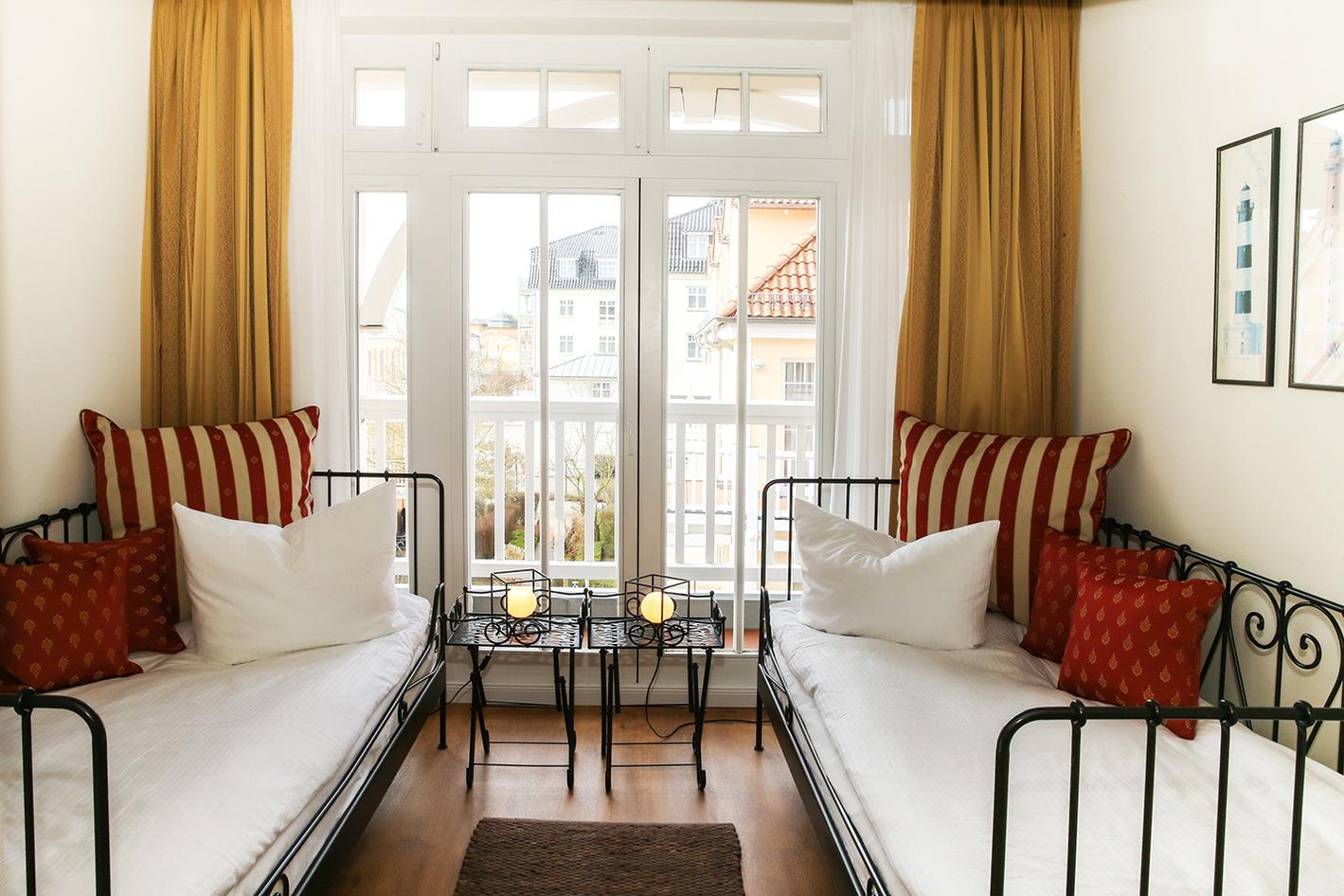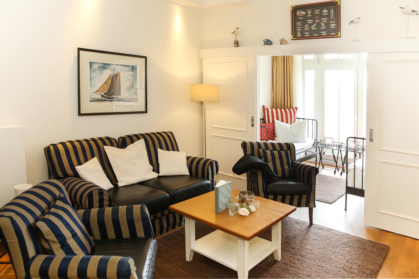 Das zweite Schlafzimmer ist vom Wohnraum durch eine zweiflügelige Schiebetür getrennt und mit zwei Einzelbetten möbliert. Bei Bedarf kann dieser Raum durch das Öffnen der Schiebetür in den Wohnraum integriert werden.