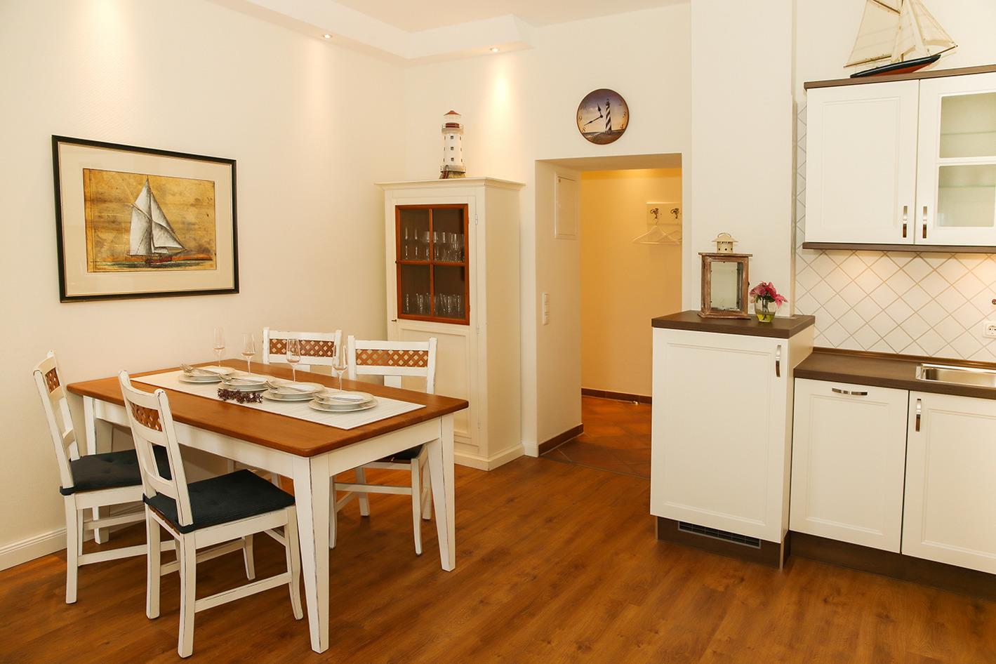 Das Wohn-und Esszimmer ist großzügig geschnitten, mit einer L-förmigen vollwertigen Küche (incl. Geschirrspülmaschine), einem Esstisch mit vier Stühlen sowie einer Sitzgruppe, bestehend aus Couch und zwei Sesseln, möbliert.