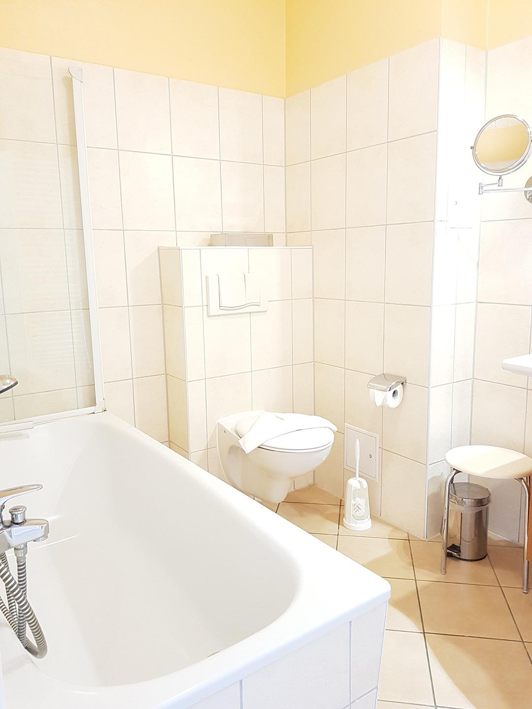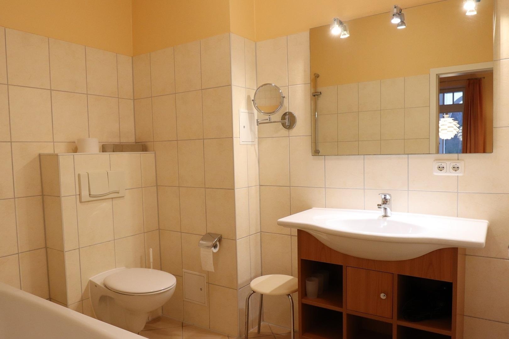 Im Badezimmer befindet sich eine Badewanne mit Duschabtrennung, sowie Waschbecken und WC.