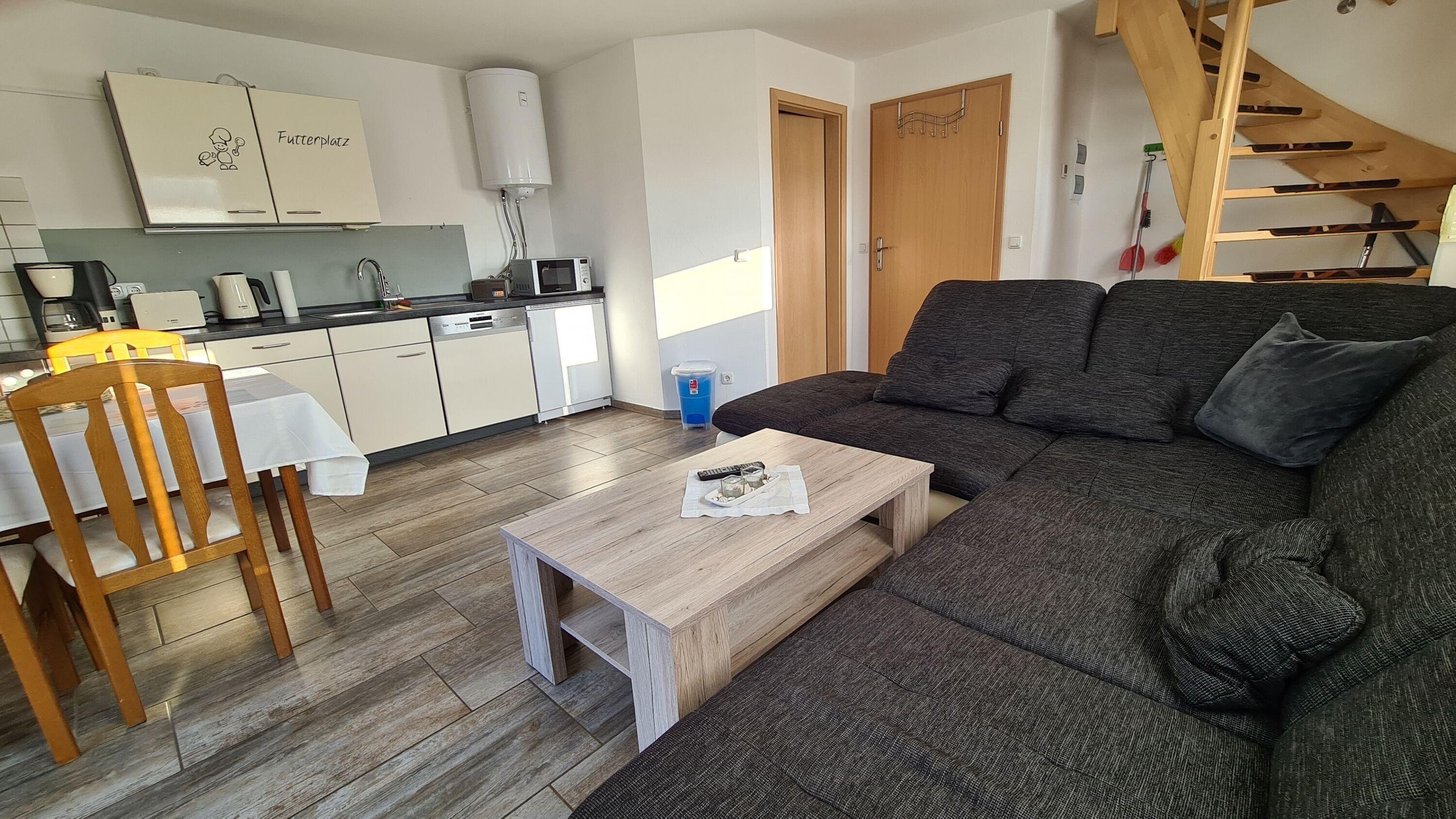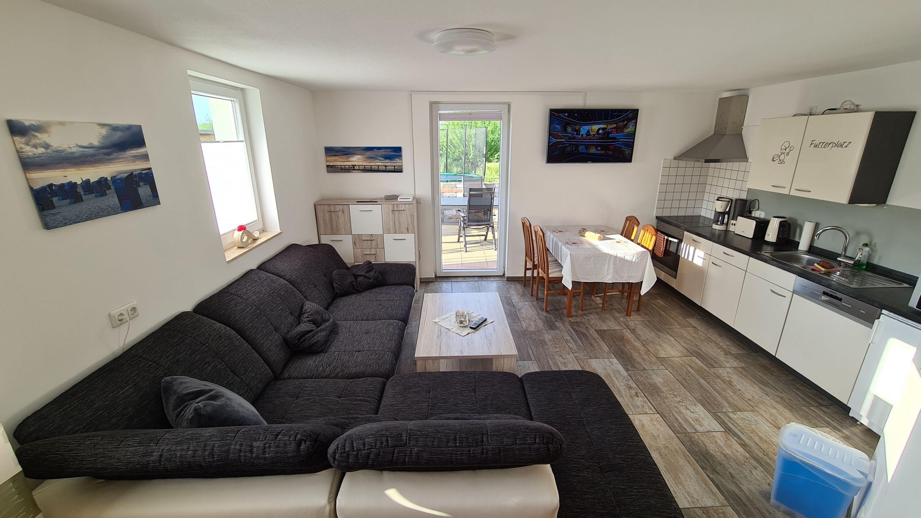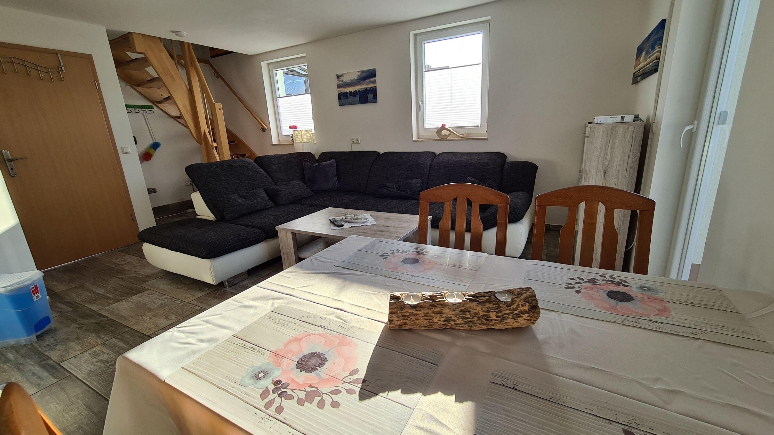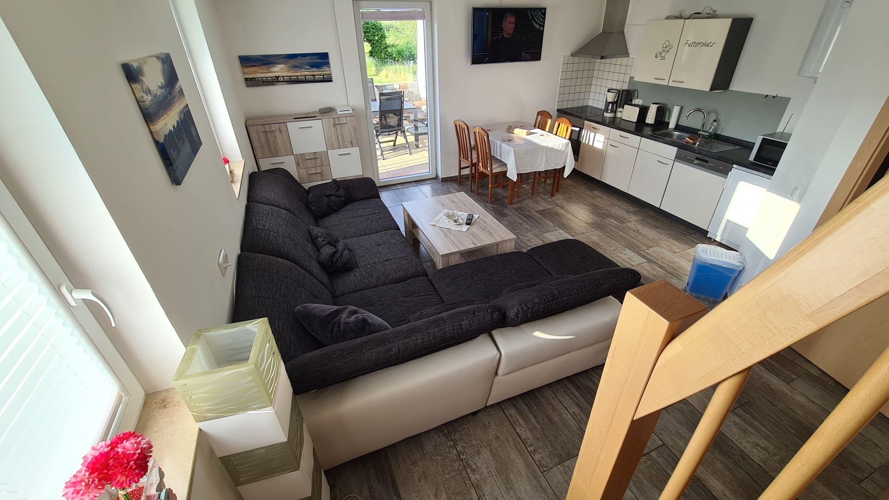 Im Erdgeschoss befindet sich ein geräumiges Wohnzimmer mit einer Couch und einem Flachbildfernseher, ein Essbereich sowie eine Küchenzeile.