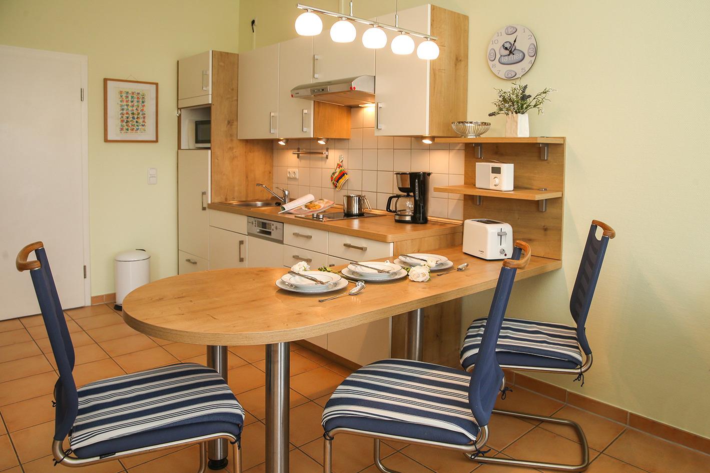 An technischem Komfort finden Sie in der offenen Küche einen Kühlschrank mit Gefrierfach, ein 4-Platten-Cerankochfeld, eine Spülmaschine, eine Mikrowelle, eine Kaffeemaschine, einen Wasserkocher sowie einen Toaster.