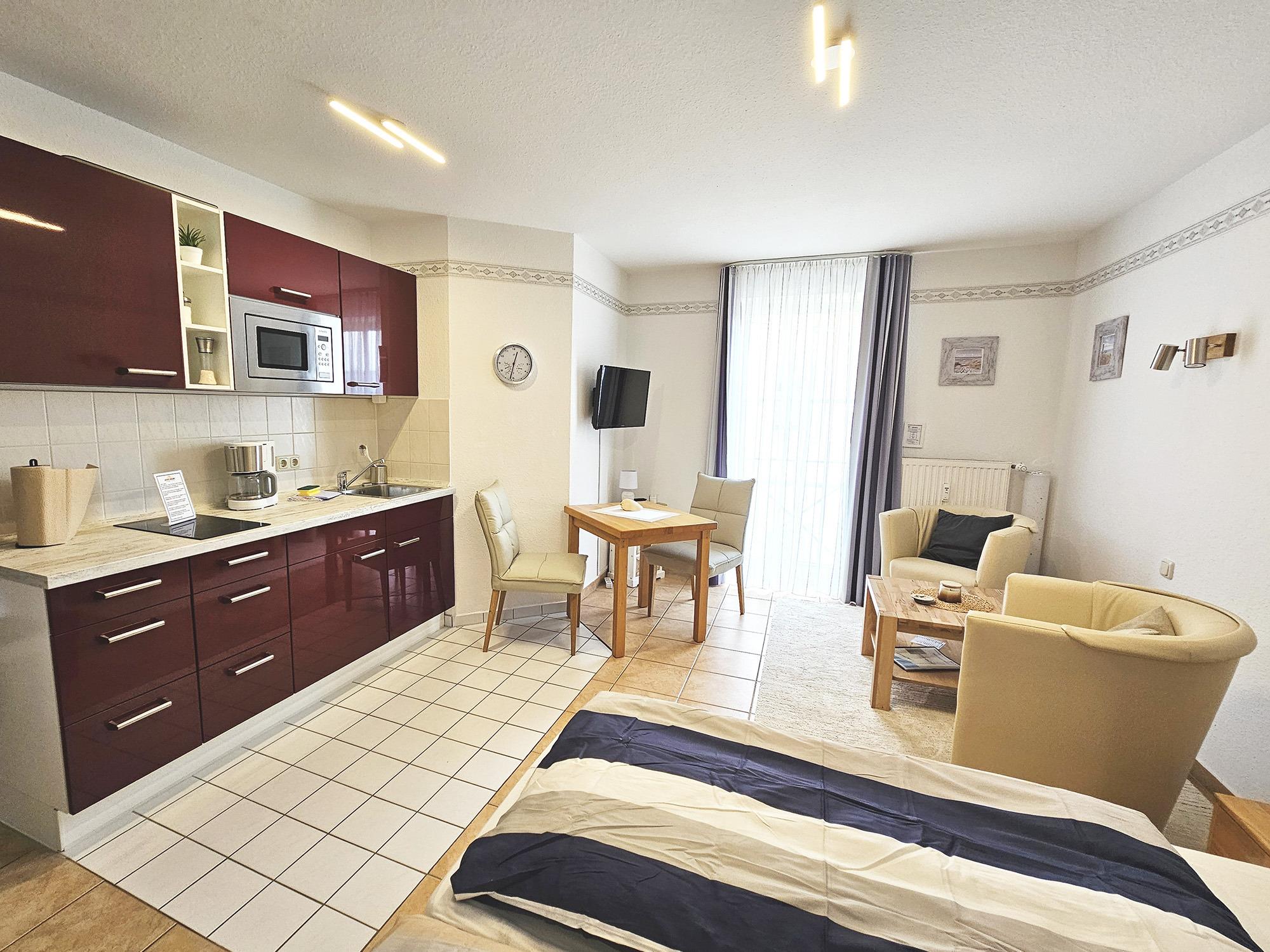 Die kleine Küchenzeile ist mit Herd, Kühlschrank, Mikrowelle, Kaffeemaschine und Wasserkocher gut ausgestattet. Falls Sie mal keine Lust auf die Gastronomie vor Ort haben, können Sie am gemütlichen Esstisch für Ihr Wohl sorgen.
