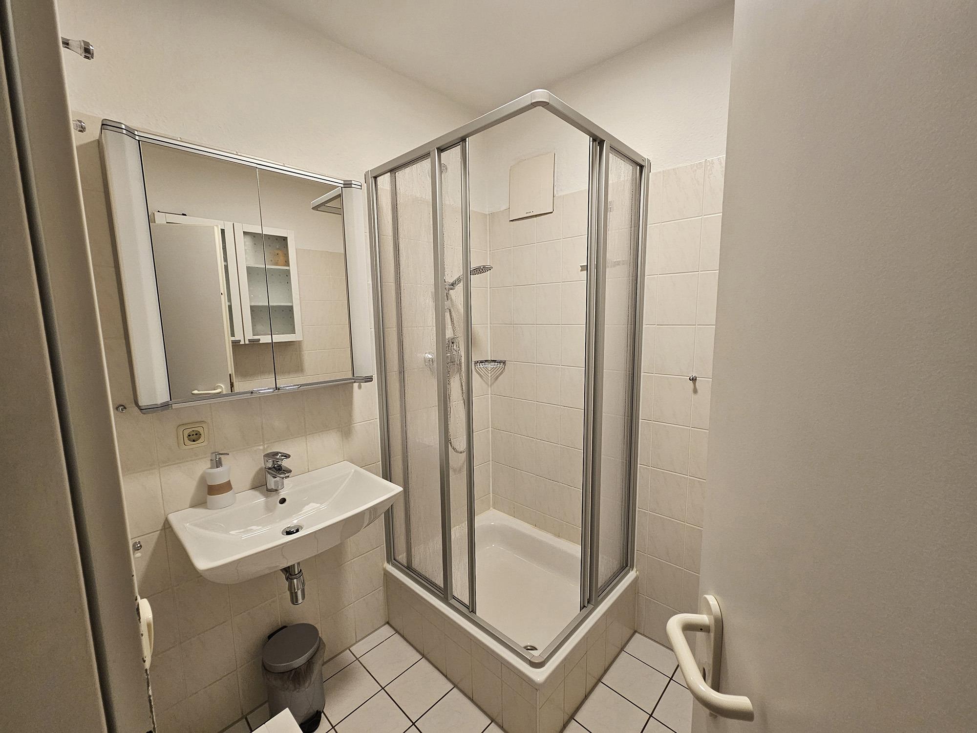 Ein Duschbad mit WC, ein kleiner Raum mit Regalen und eine Garderobe ergänzen die Ferienwohnung. Zusätzlich steht Ihnen ein Fernseher mit 56 TV-Programmen, ein Radiowecker und ein WLAN-Hotspot-Zugang zur Verfügung. Sowohl der PKW-Stellplatz direkt am Haus als auch der Fahrradraum im Nebengebäude können kostenfrei genutzt werden.