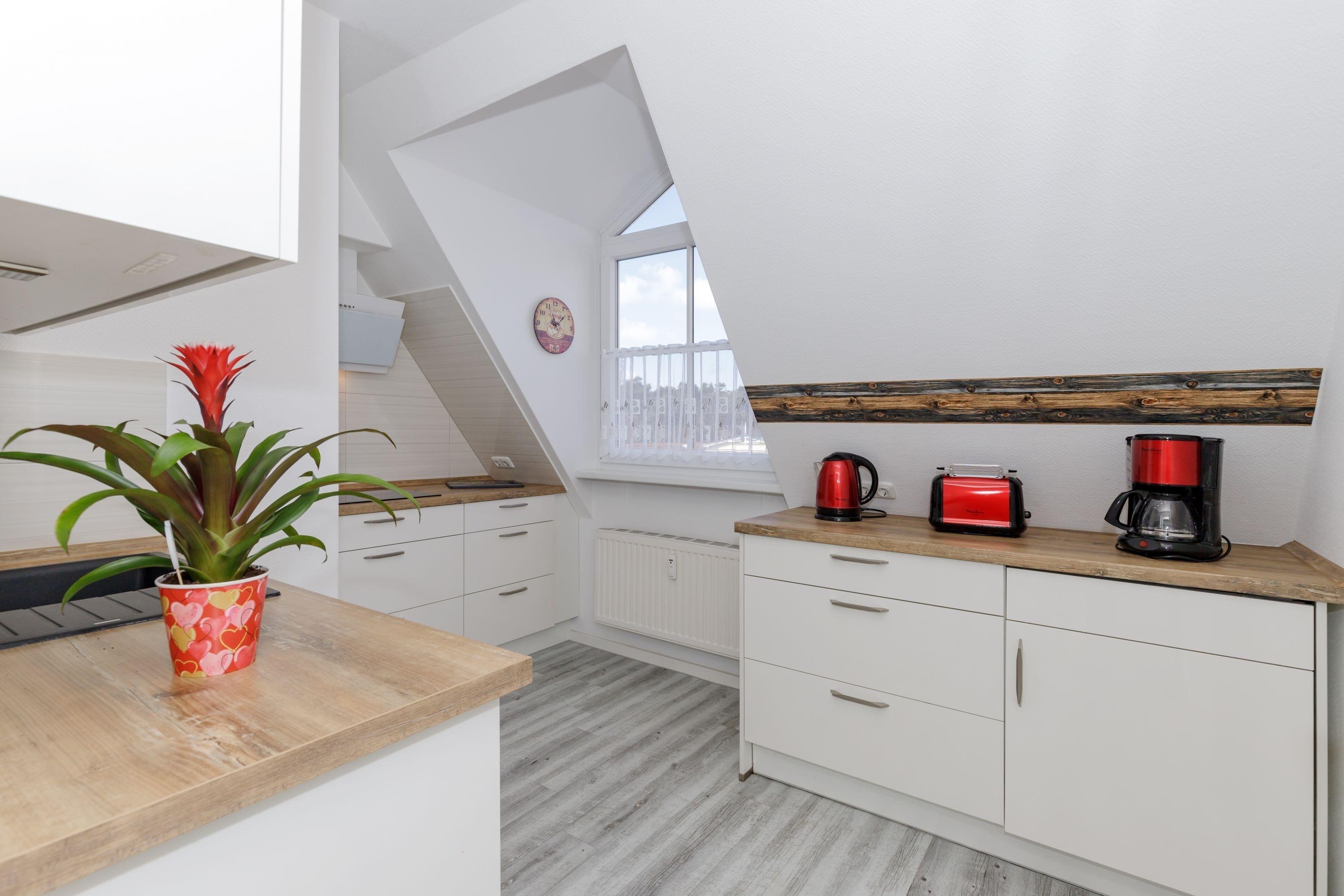 Mit dem Fahrstuhl gelangen Sie in das Appartement im 4. Obergeschoss. Über eine Treppe erreichen Sie den Schlafbereich auf der Galerie. Es verfügt über ein geräumiges Wohnzimmer mit Essbereich einem Flachbild-TV, ein Schlafzimmer mit Doppelbett sowie ein Badezimmer mit Dusche. Über die Galerie erreichen Sie die Dachterrasse, die einen exklusiven Blick auf Kühlungsborn bietet.