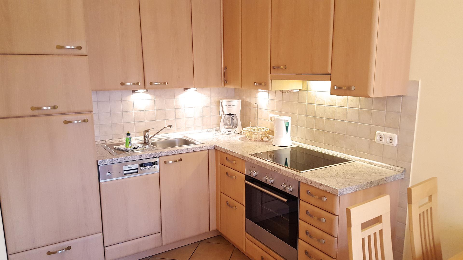 Die integrierte Küche ist u.a. mit Geschirrpüler, 4-Platten-Herd, Backofen, Mikrowelle, Kaffeemaschine, Wasserkocher und Toaster ausgestattet. Ein Esstisch und 4 Stühle laden zum gemütlichen Speisen ein.