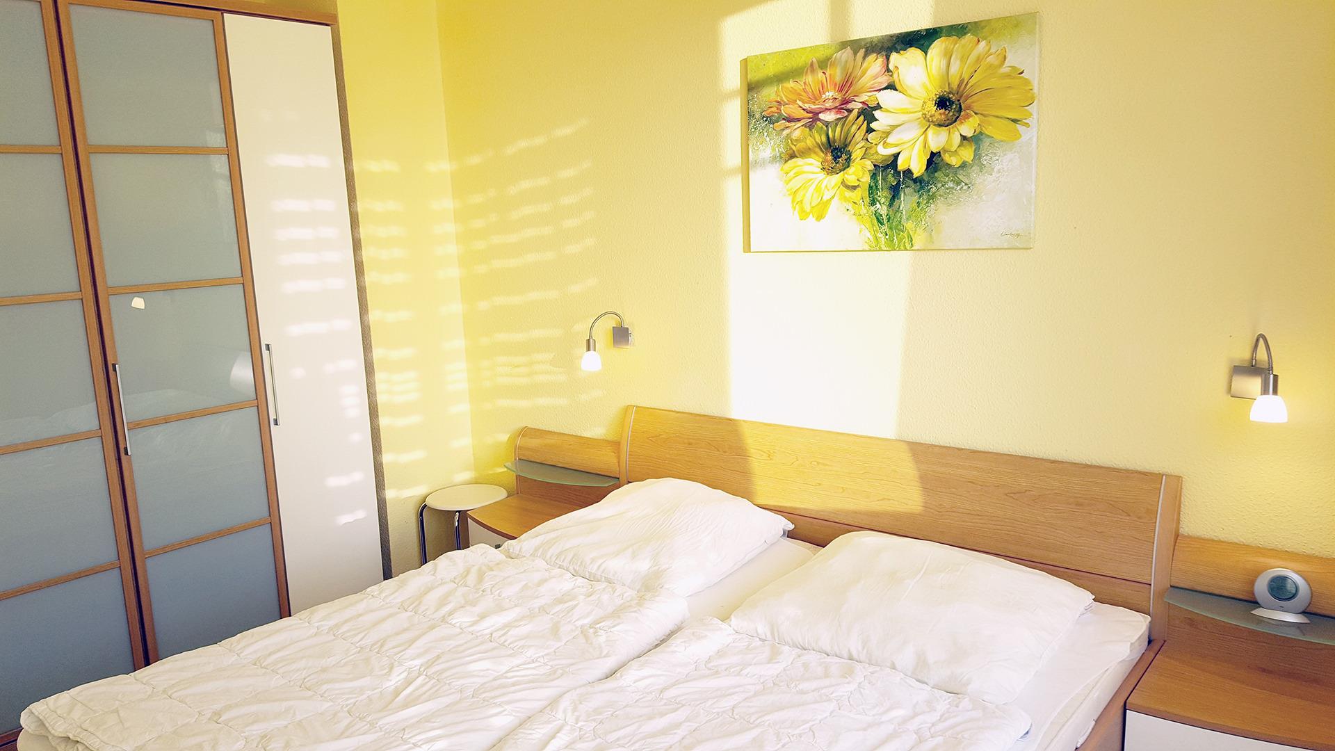 Vom Wohnzimmer aus gelangen Sie über eine kleine Leseecke ins Schlafzimmer mit einem Doppelbett 180 x 200 cm und Kleiderschrank.