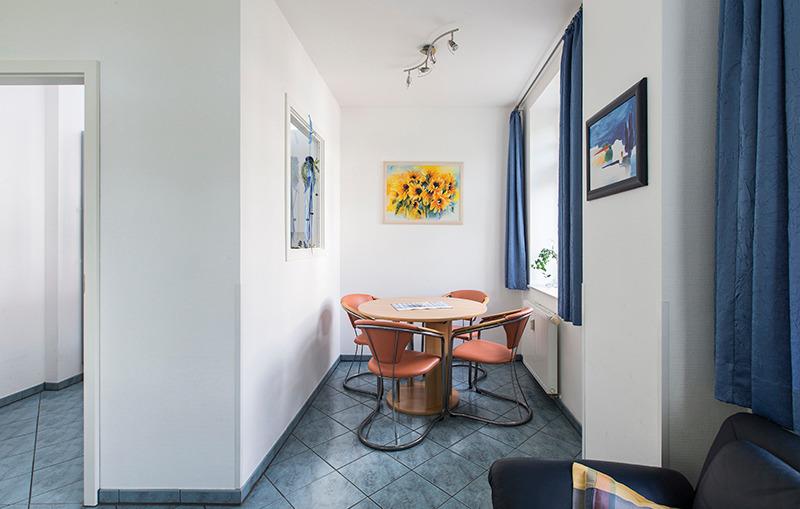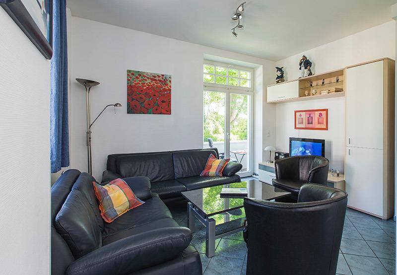 Sie ist hell und freundlich möbliert mit einem Wohnbereich mit Sitzgruppe, Farb-TV, DVD-Player sowie einem Esstisch.