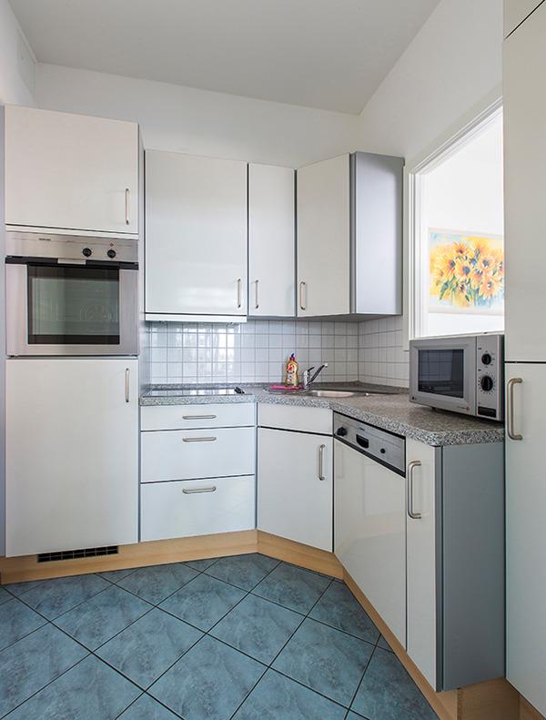 Die moderne Küche ist mit 4-Platten-Herd, Geschirrspüler und Mikrowelle eingerichtet.