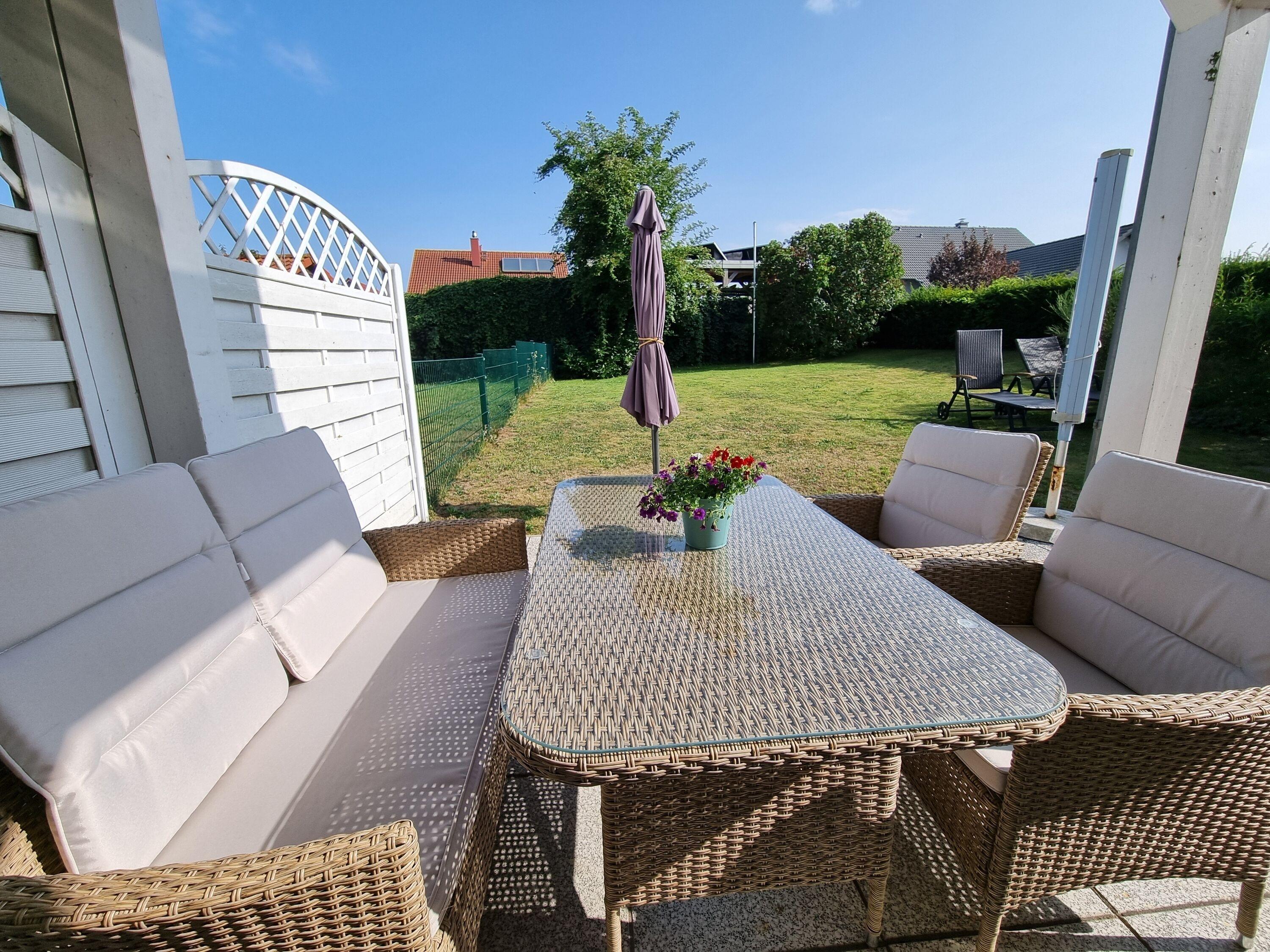 Die Terrasse befindet sich auf der Ostseite und grenzt an eine Wiese, auf der sich die Haustiere austoben können.