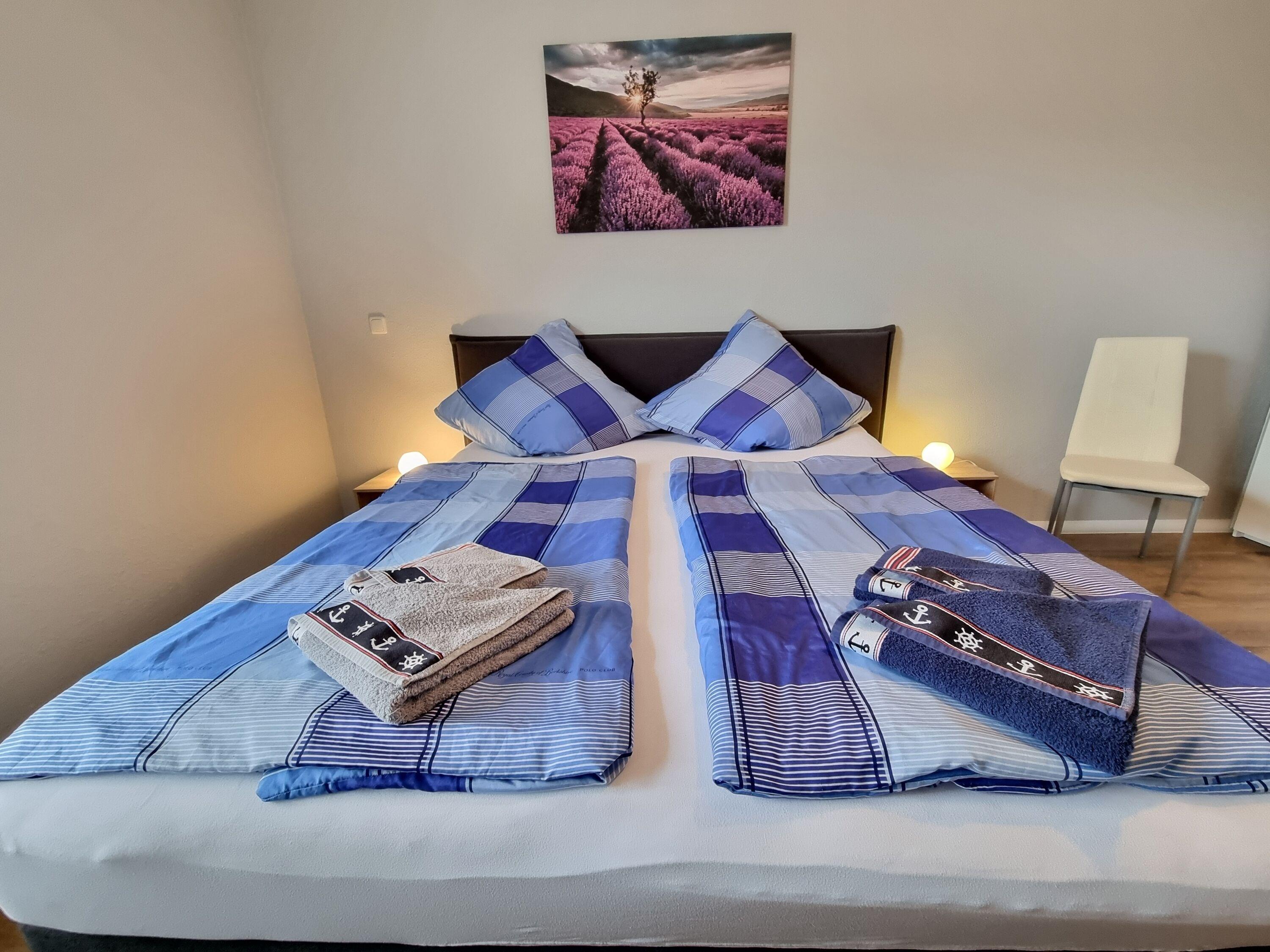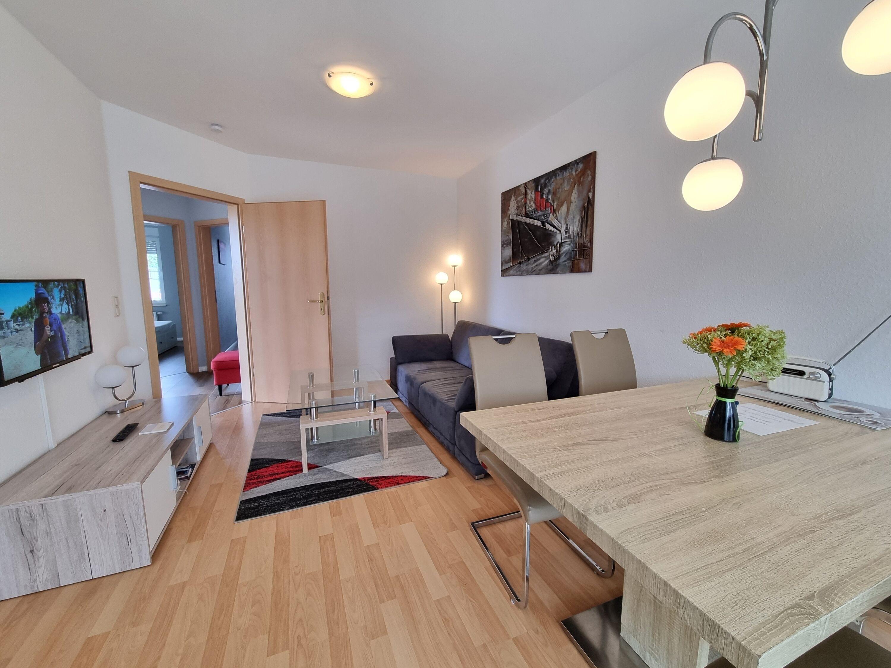 Die Wohnung ist großzügig geschnitten und verfügt über 3 Zimmer auf insgesamt 60m² im Erdgeschoss. Sie bietet Platz für 4 Personen und verfügt über zwei Schlafzimmer, eines mit einem Doppelbett und eines mit einem ausziehbaren Einzelbett für jeweils bis zu 2 Personen.