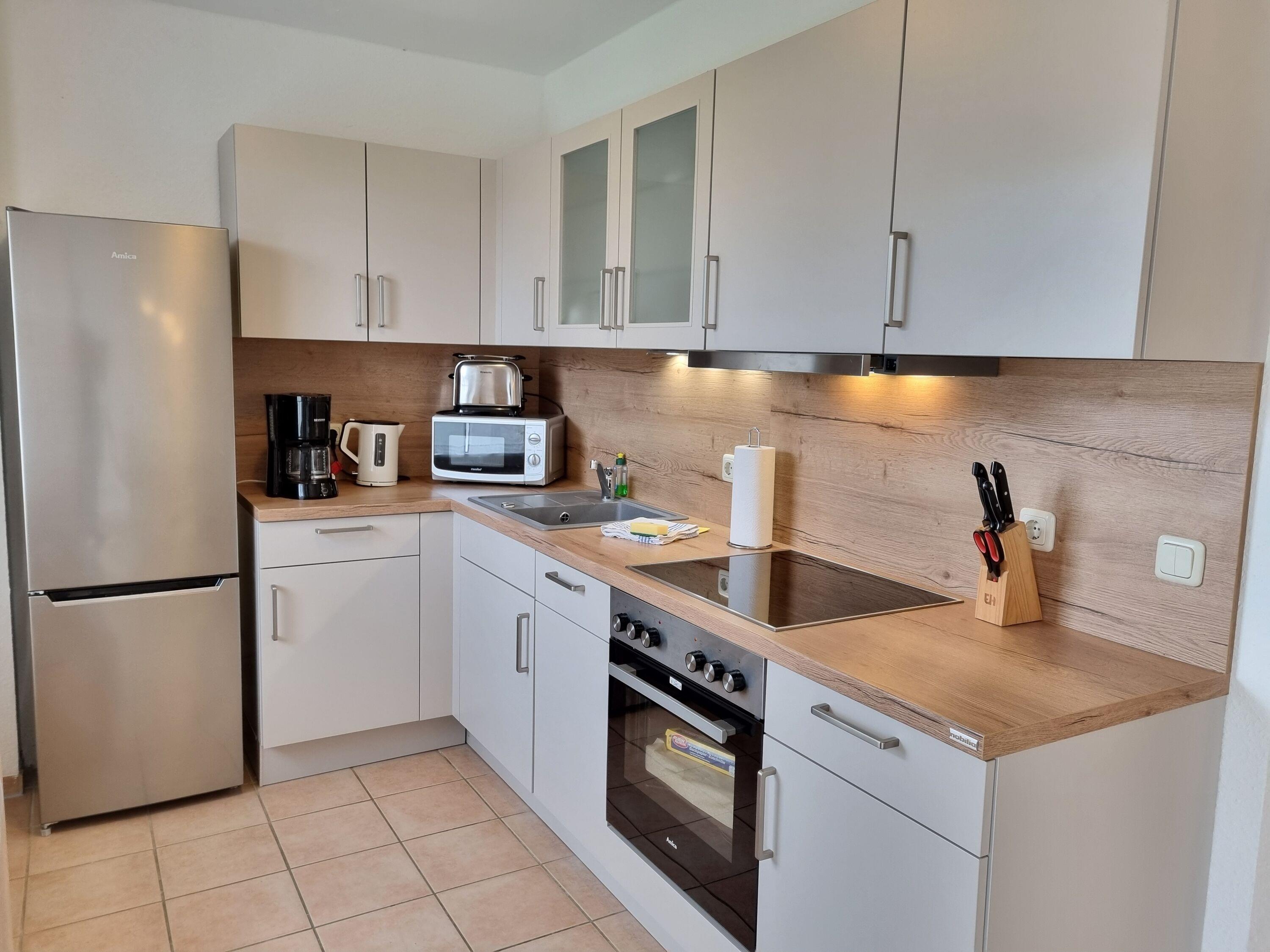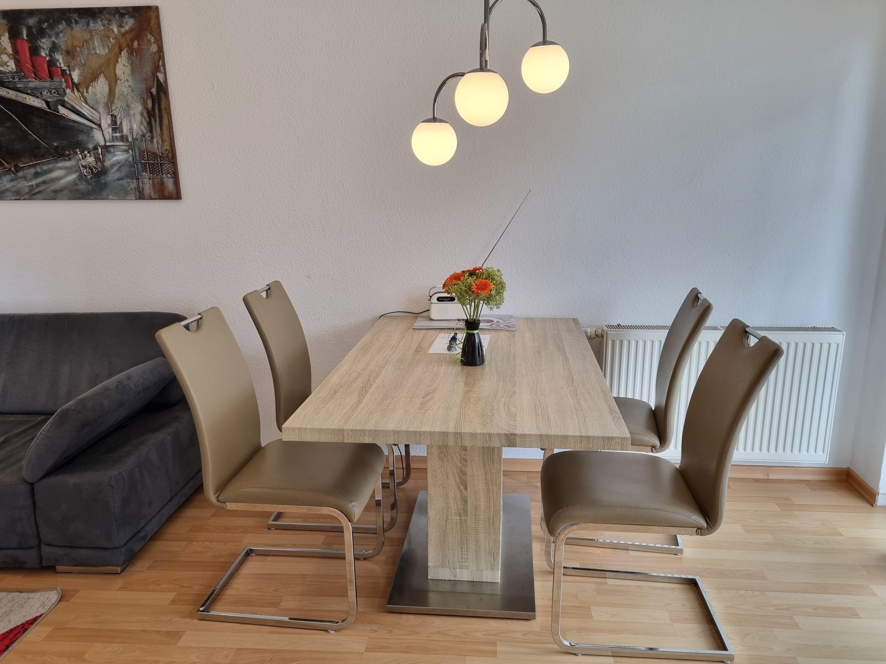Die Wohnküche ist mit einer großen Essgruppe und einer voll ausgestatteten Einbauküche ausgestattet.