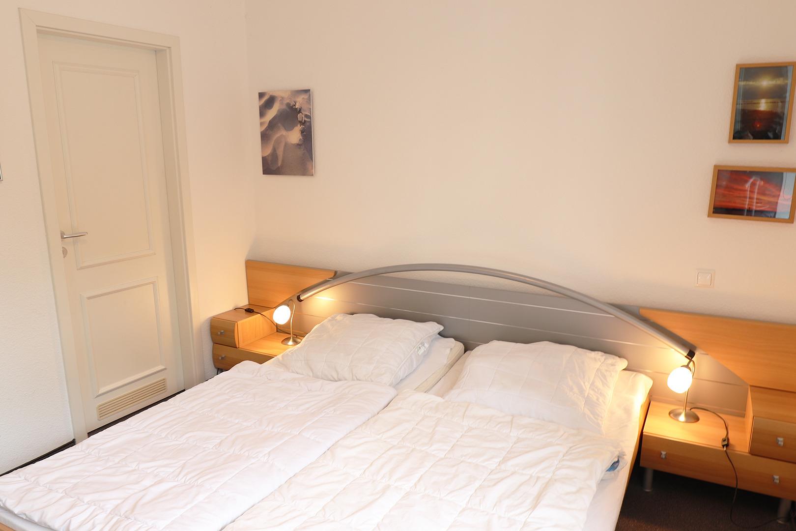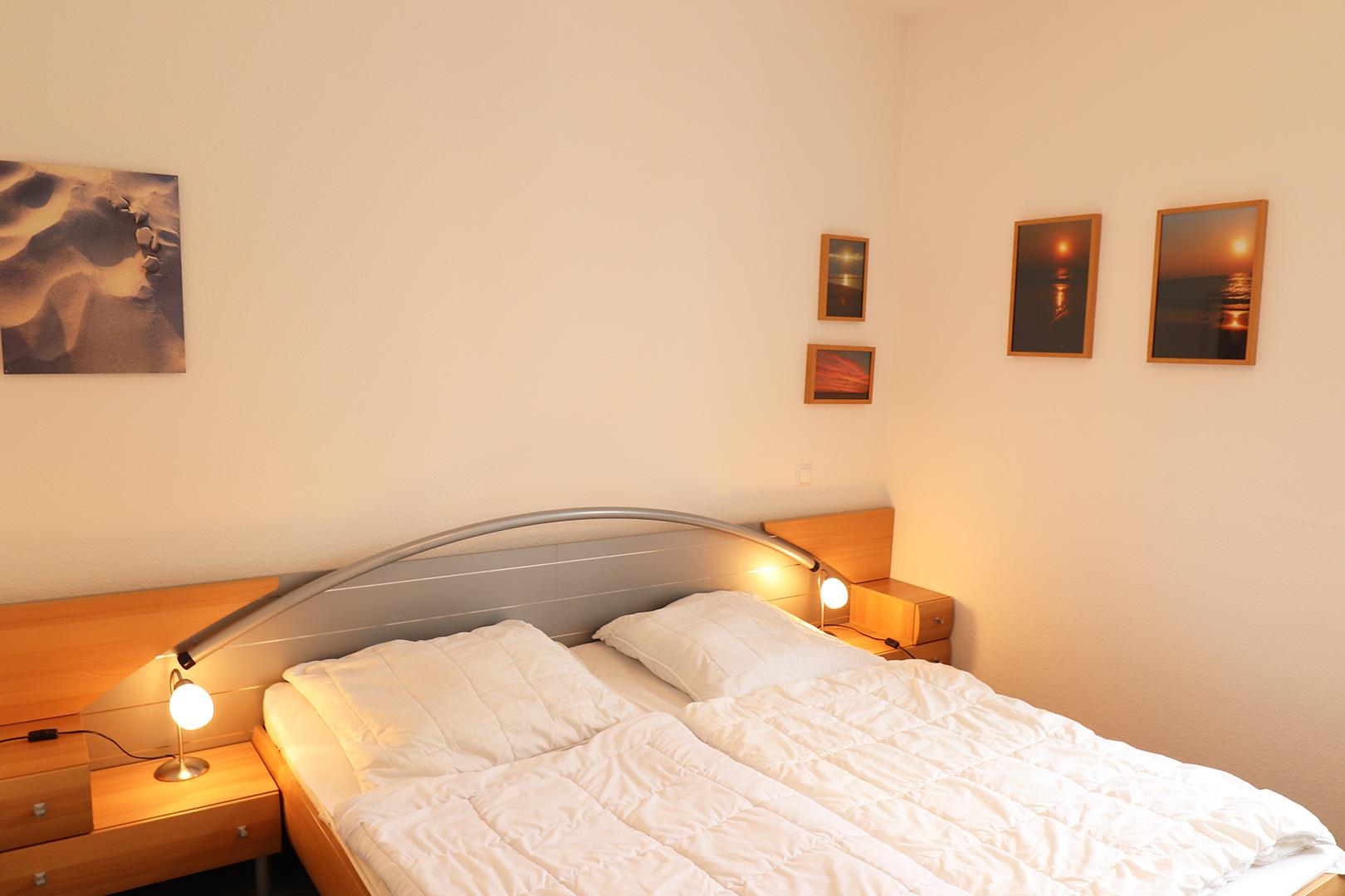 Im großen Schlafzimmer finden Sie ein Doppelbett. Hell und freundlich eingerichtet verfügt der Wohnbereich über eine Sitzgruppe und Esstisch sowie eine ausziehbare Couch und ein Schrankbett.
