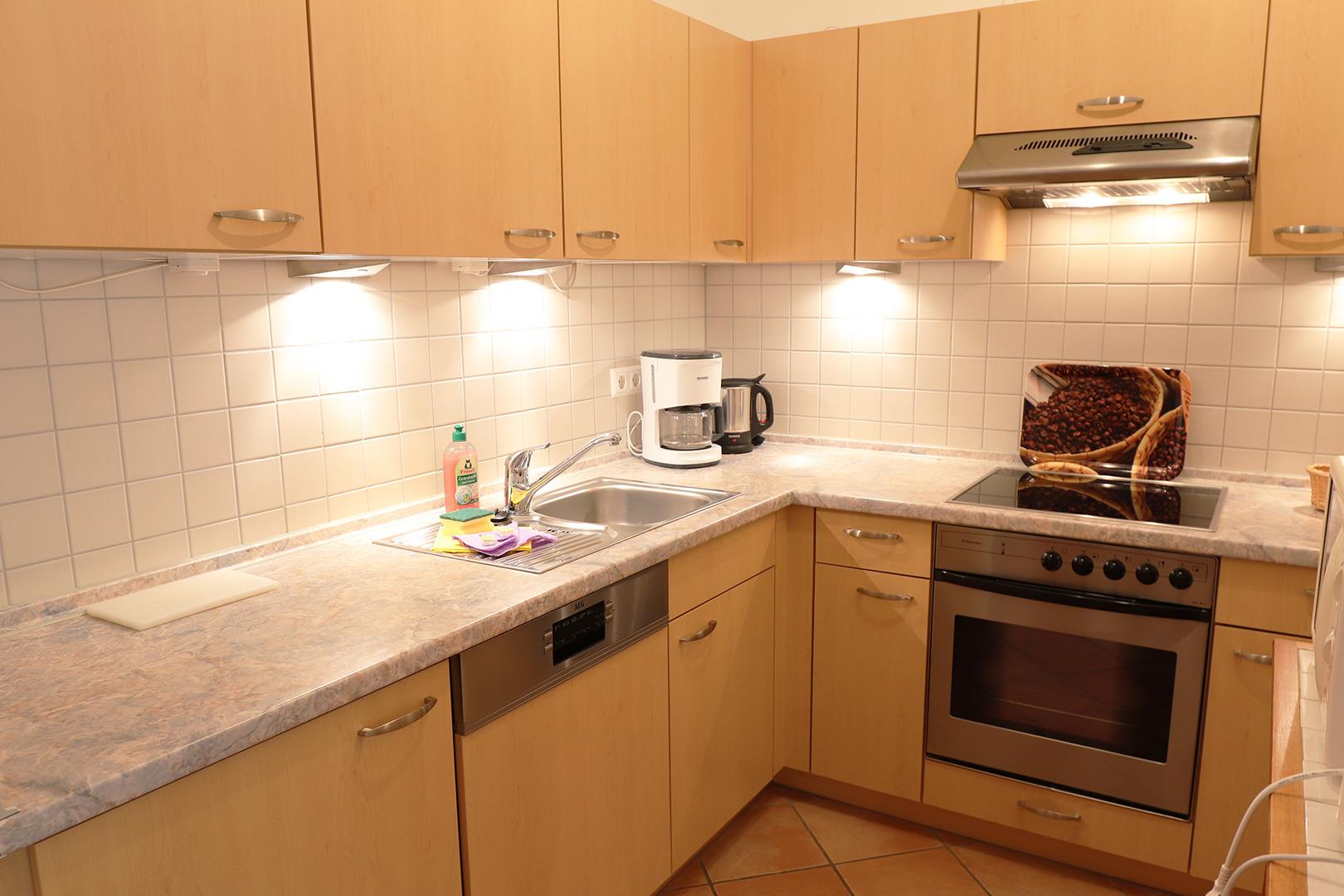 Die moderne Küche mit Geschirrspüler und Mikrowelle verfügt über allen Komfort . Zur technischen Ausstattung gehören Farb-TV und kleine Hifi-Anlage.
