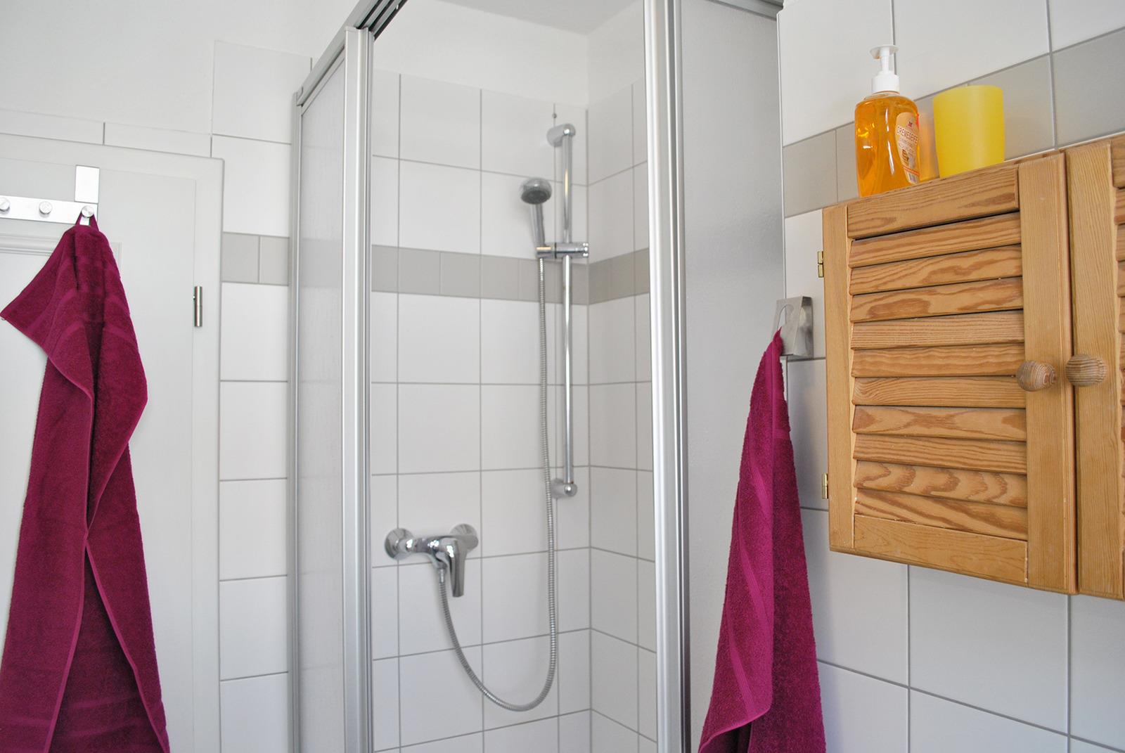 Wohnbereich und das Duschbad/WC sind mit Fliesen ausgelegt.