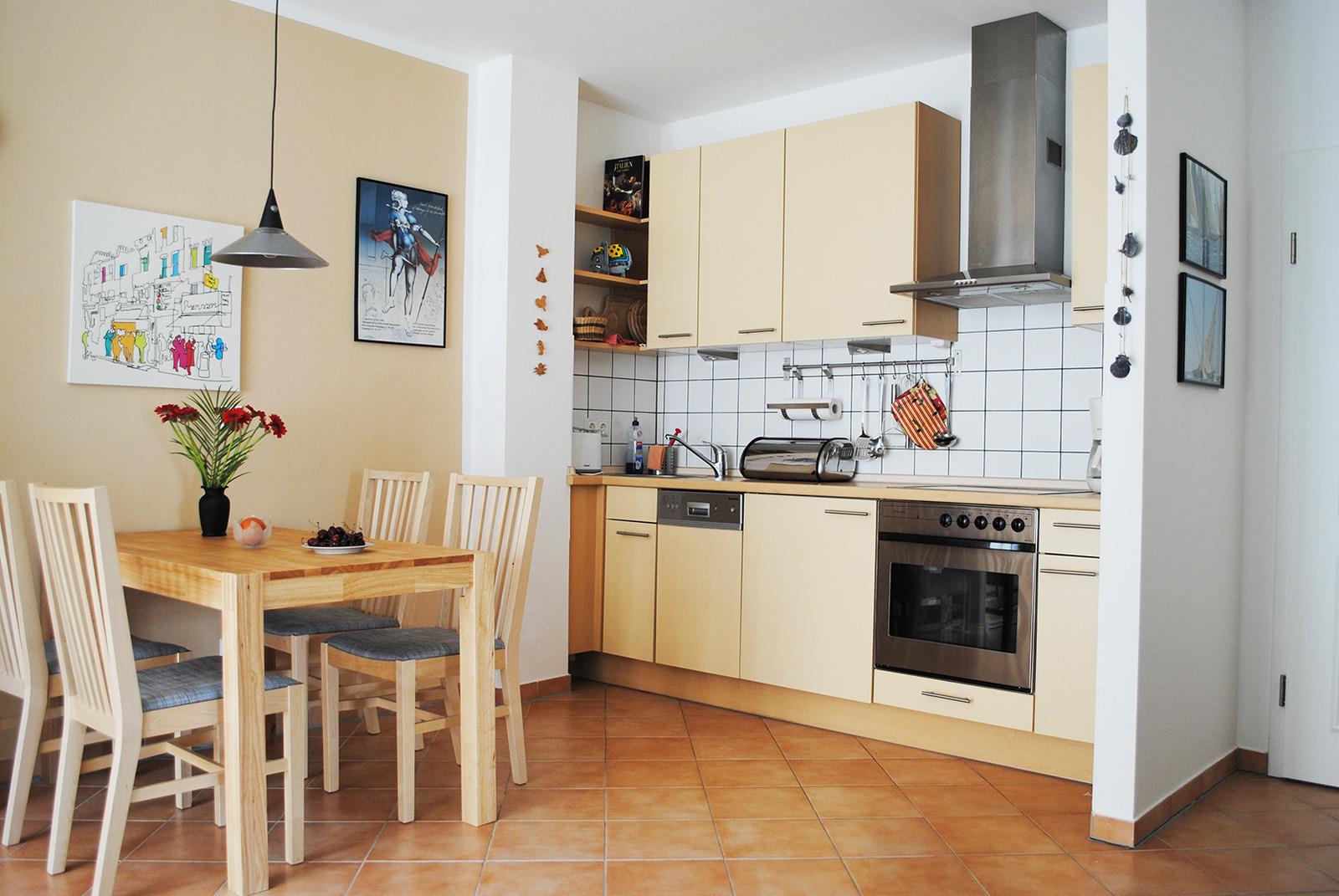 Im Wohnbereich ist eine Schlafcouch für 2 Personen, ein Esstisch sowie eine Pantryküche mit 4-Platten-Ceranfkochfeld, Backofen und Geschirrspüler. Der