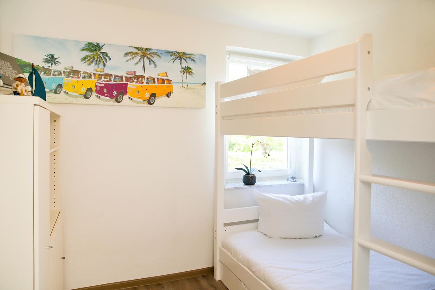 Ein Schlafzimmer ist mit einem Flachbildfernseher, Doppelbett und einem dreitürigen Kleiderschrank ausgestattet das zweite mit Etagenbett und Schrank für die ganz kleinen Gäste ist ein Babybett und Hochstuhl vorhanden.