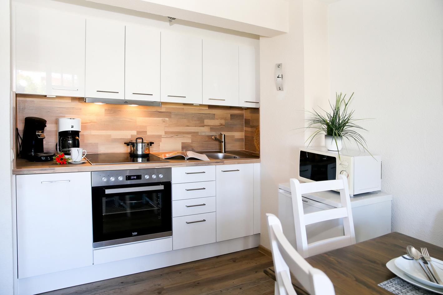 Die Pantry-Küche verfügt über ein Ceran-Kochfeld mit Dunstabzugshaube, Mikrowelle, Geschirrspüler, Backofen und einem Kühlschrank mit Gefrierfach.
