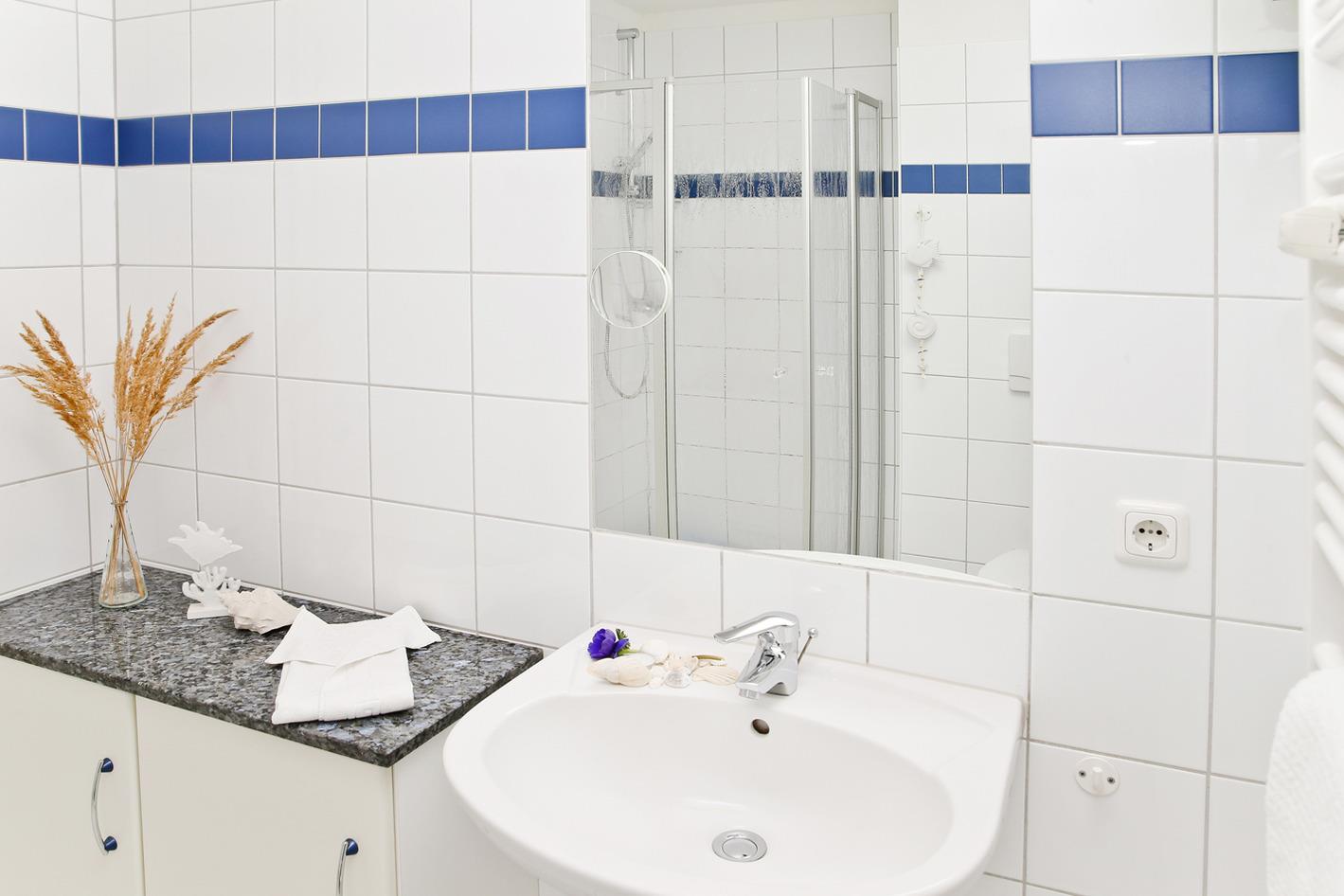 Im Schlafzimmer mit Doppelbett verleben Sie eine ruhige Nacht. Das Duschbad/WC rundet die Ferienwohnung ab.