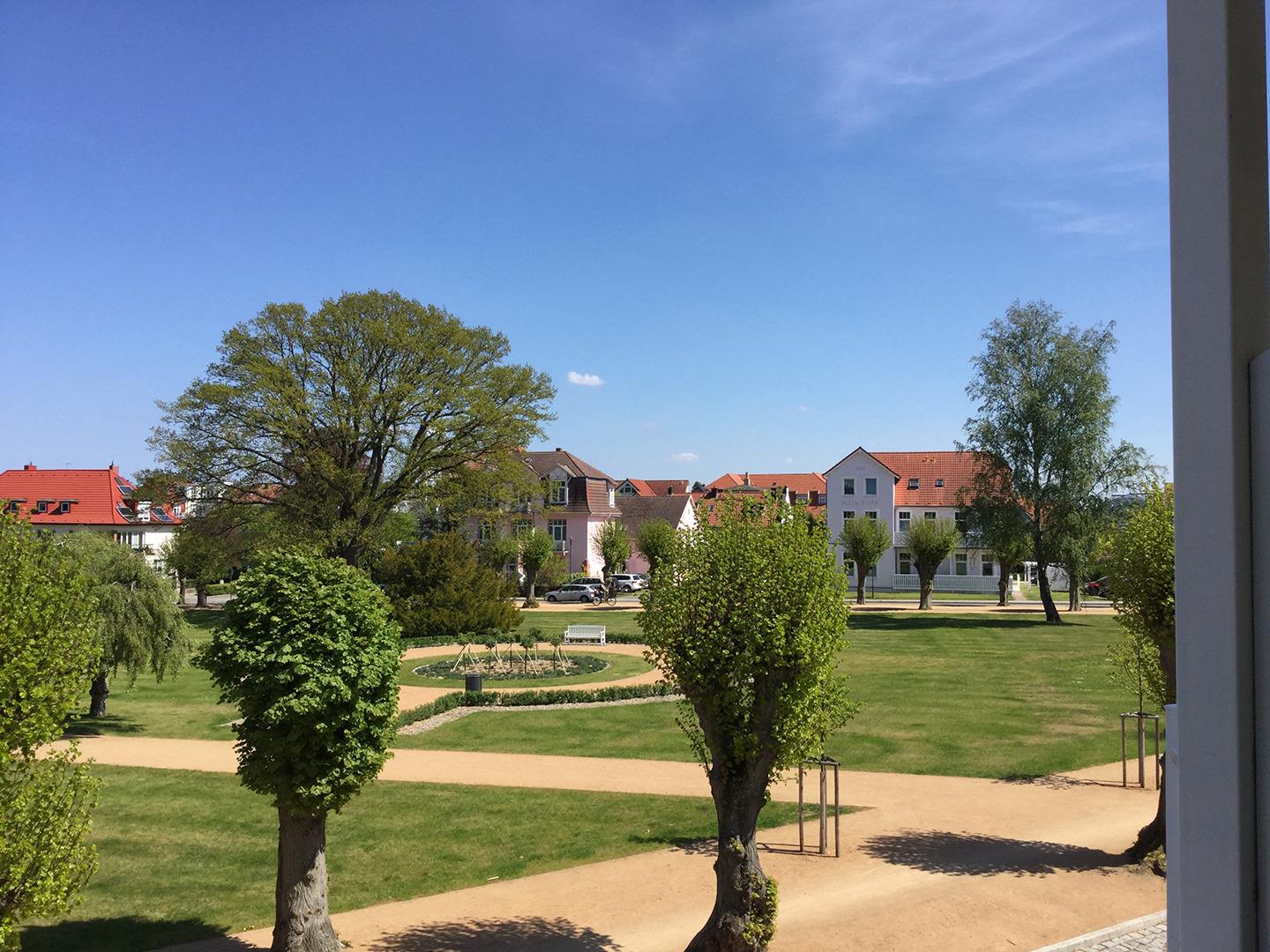 Im gemütlichen Wohnzimmer ist neben einer Sitzgruppe mit Sofa und Sessel, ein Vitrinenschrank mit einem TV-Gerät und eine schöne Essecke untergebracht. Der großzügige Balkon mit Tisch und Stühlen lädt zum Verweilen ein und bietet einen idyllischen Blick auf den gegenüberliegenden, wieder in seinem ursprünglichen Stil hergerichteten Lindenpark. Damit liegt die Wohnung zentral und zugleich im Grünen.