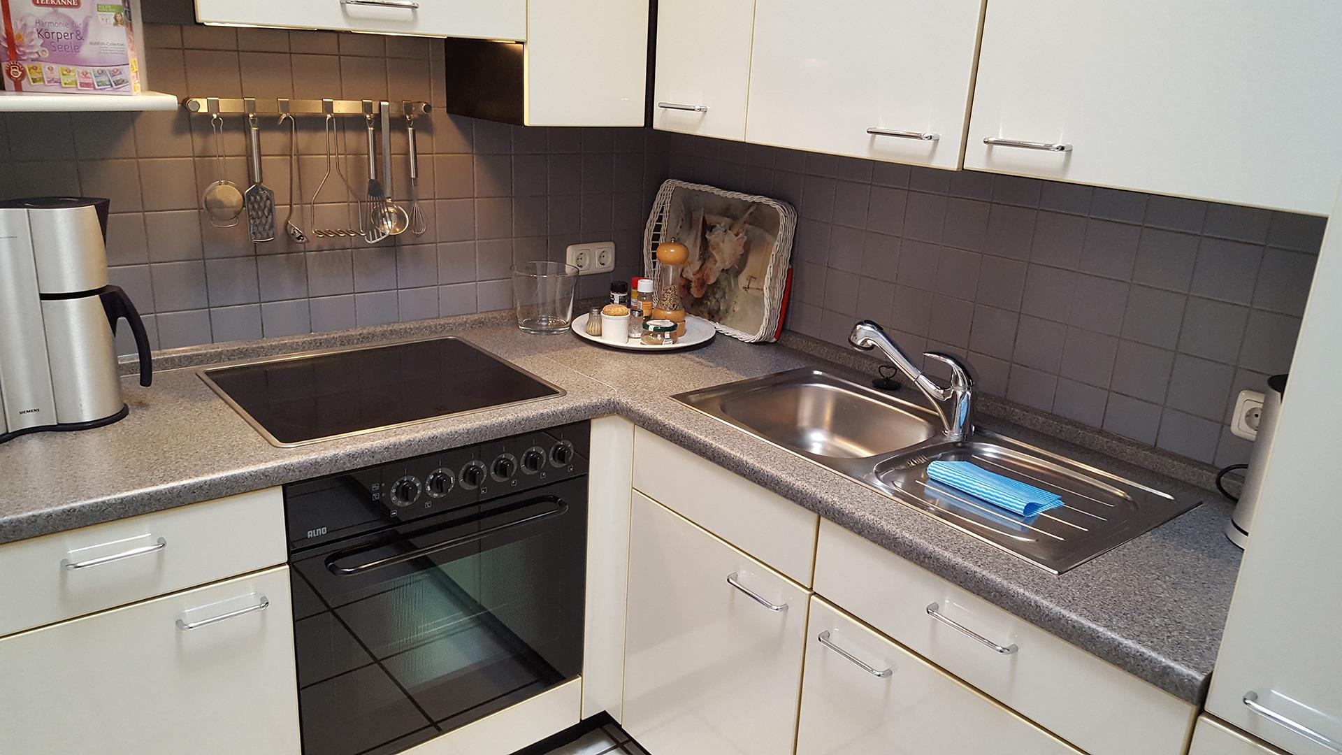 Eine separate Küche mit Cerankochfeld, Backofen und Kühlschrank sowie Wasserkocher, Kaffemaschine und Toaster ist vorhanden.