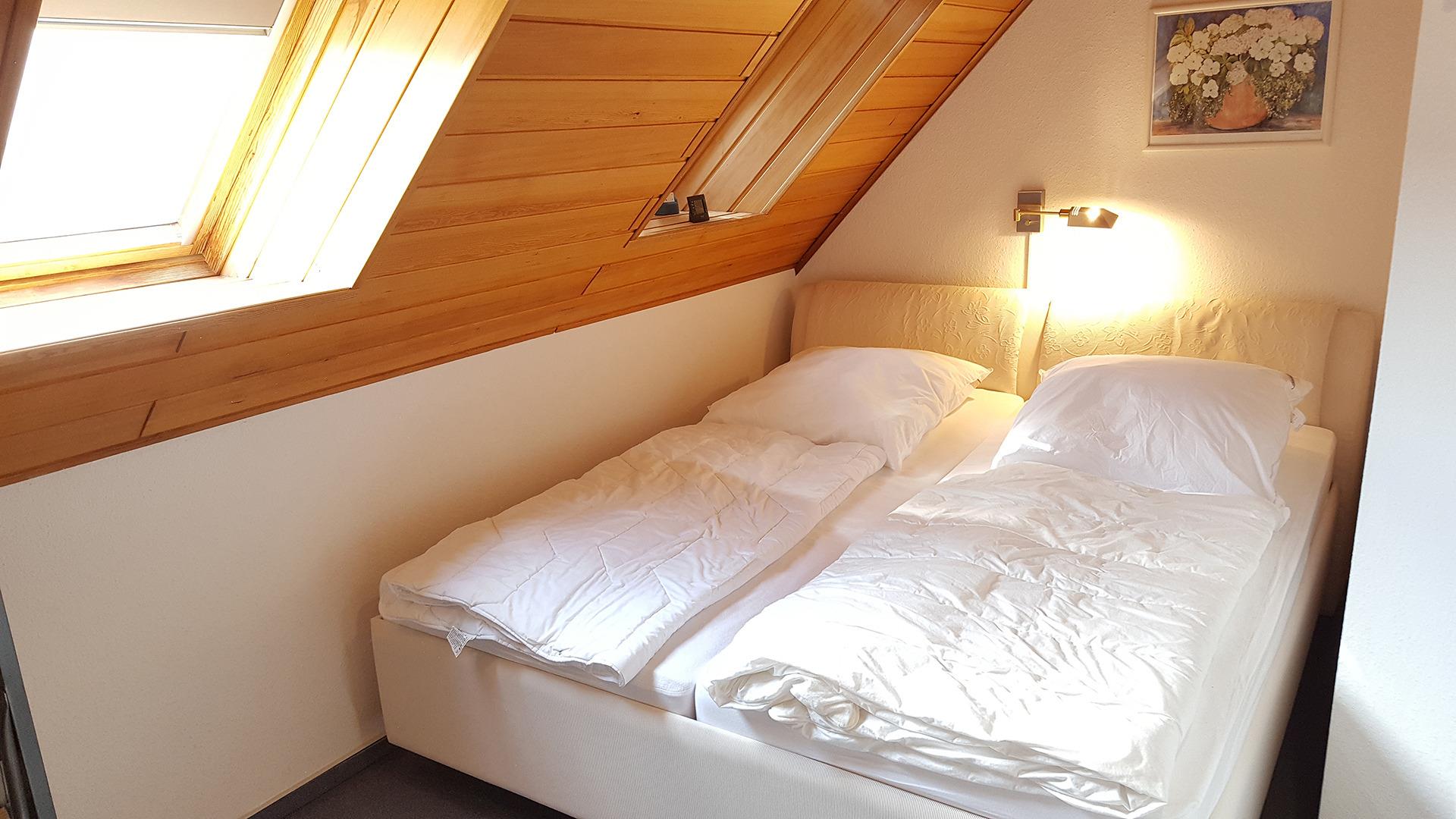 Im Schlafzimmer finden Sie ein Ruf-Doppelbett (2m x 2m). Das Duschbad/WC vervollständigt die schöne Ferienwohnung.