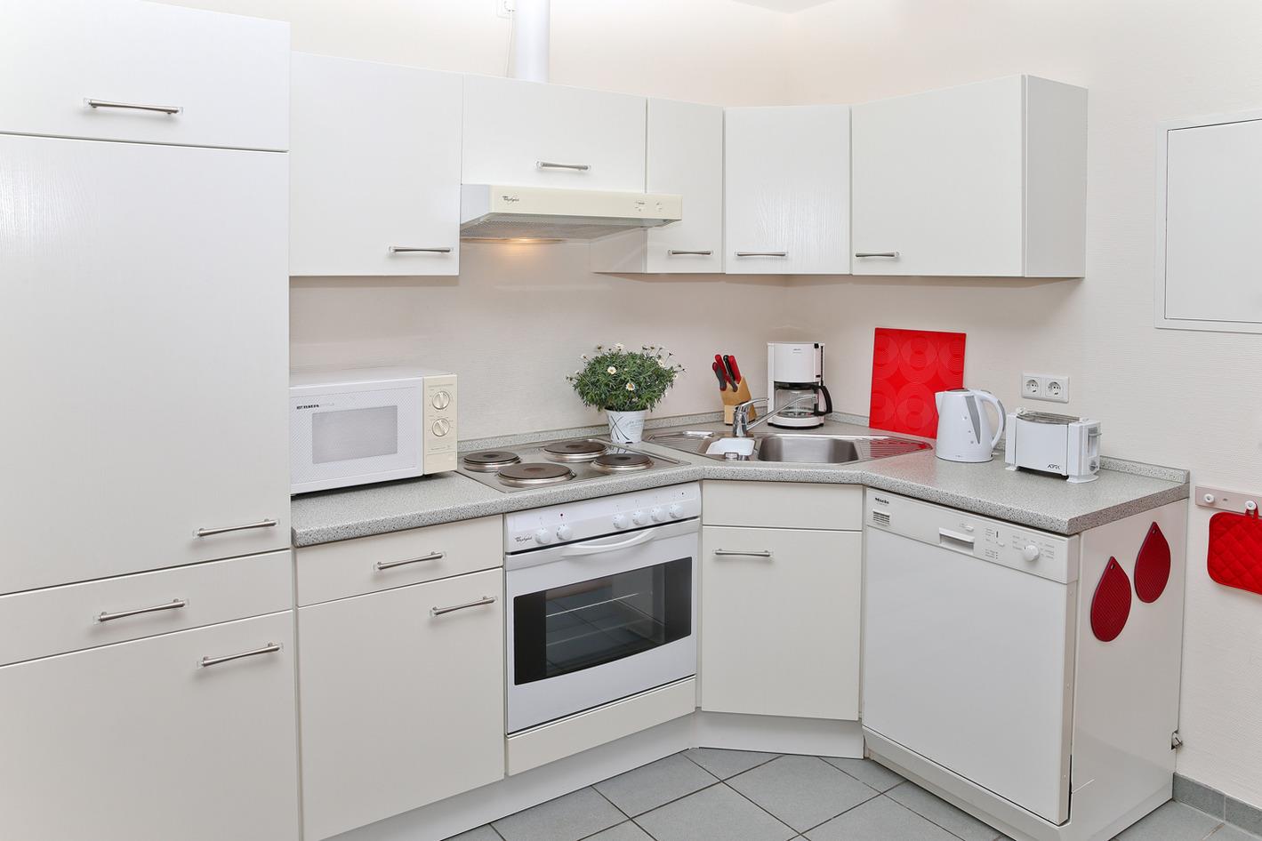 eine Küchenzeile mit Mikrowelle, 4-Platten-Herd mit Backfach und einen Geschirrspüler.