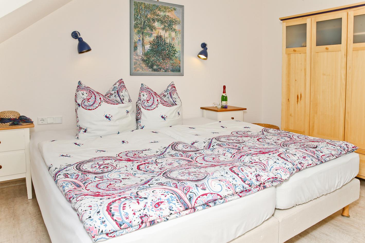 Aufgeteilt ist die moderne sehr helle Ferienwohnung in ein Schlafzimmer mit Doppelbett, ein Schlafzimmer mit Etagenbett (Kinderzimmer), ein Wohnbereich mit Panoramafenster, eine Dachterrasse und ein Balkon.