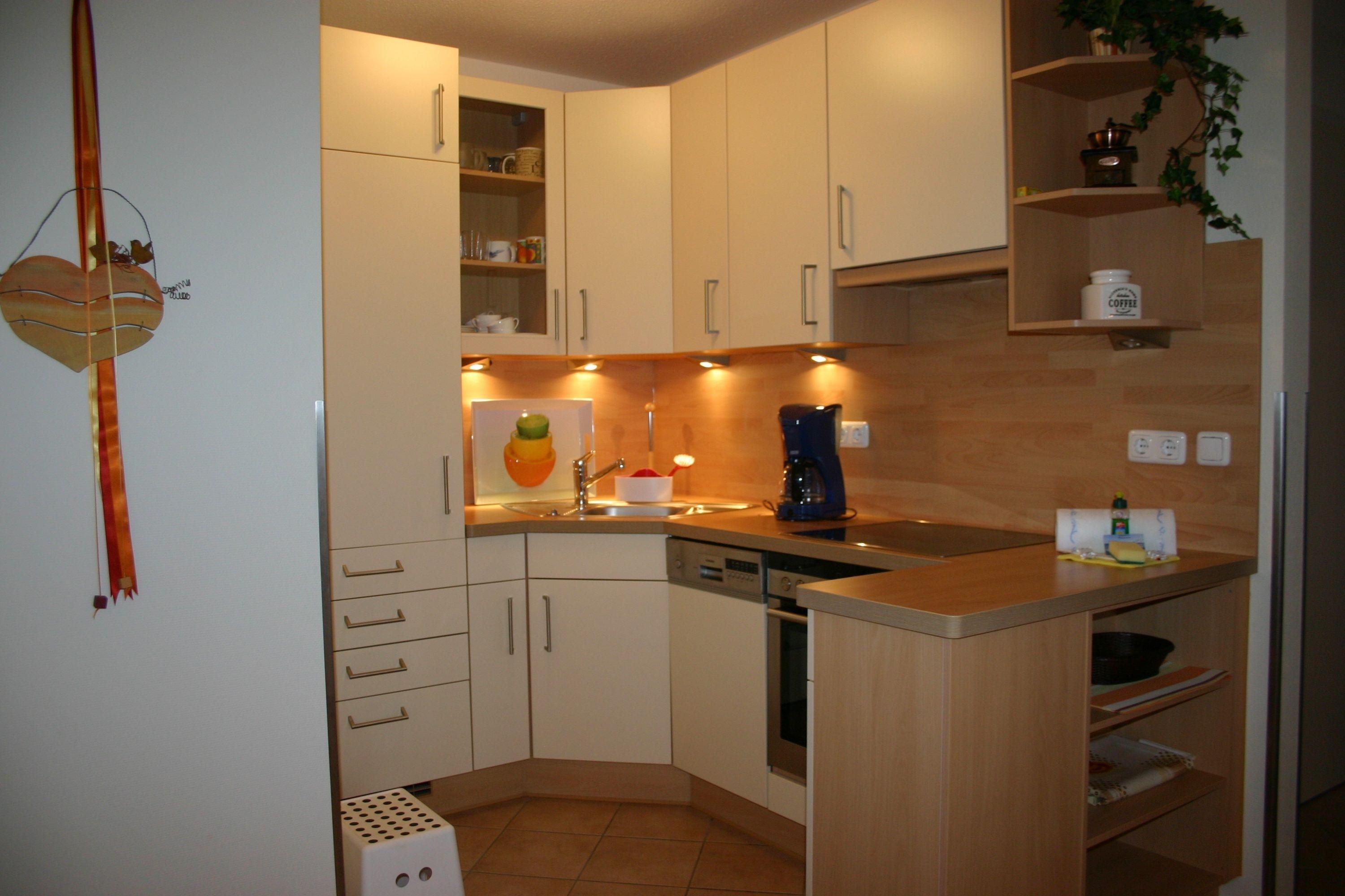 Die moderne Küchenzeile mit Cerankochfeld u. Geschirrspüler ist im Wohnbereich integriert.