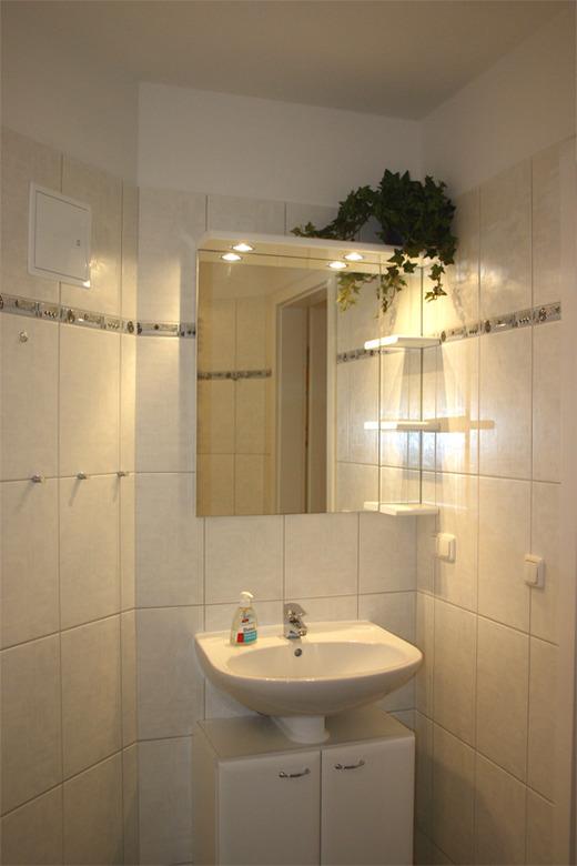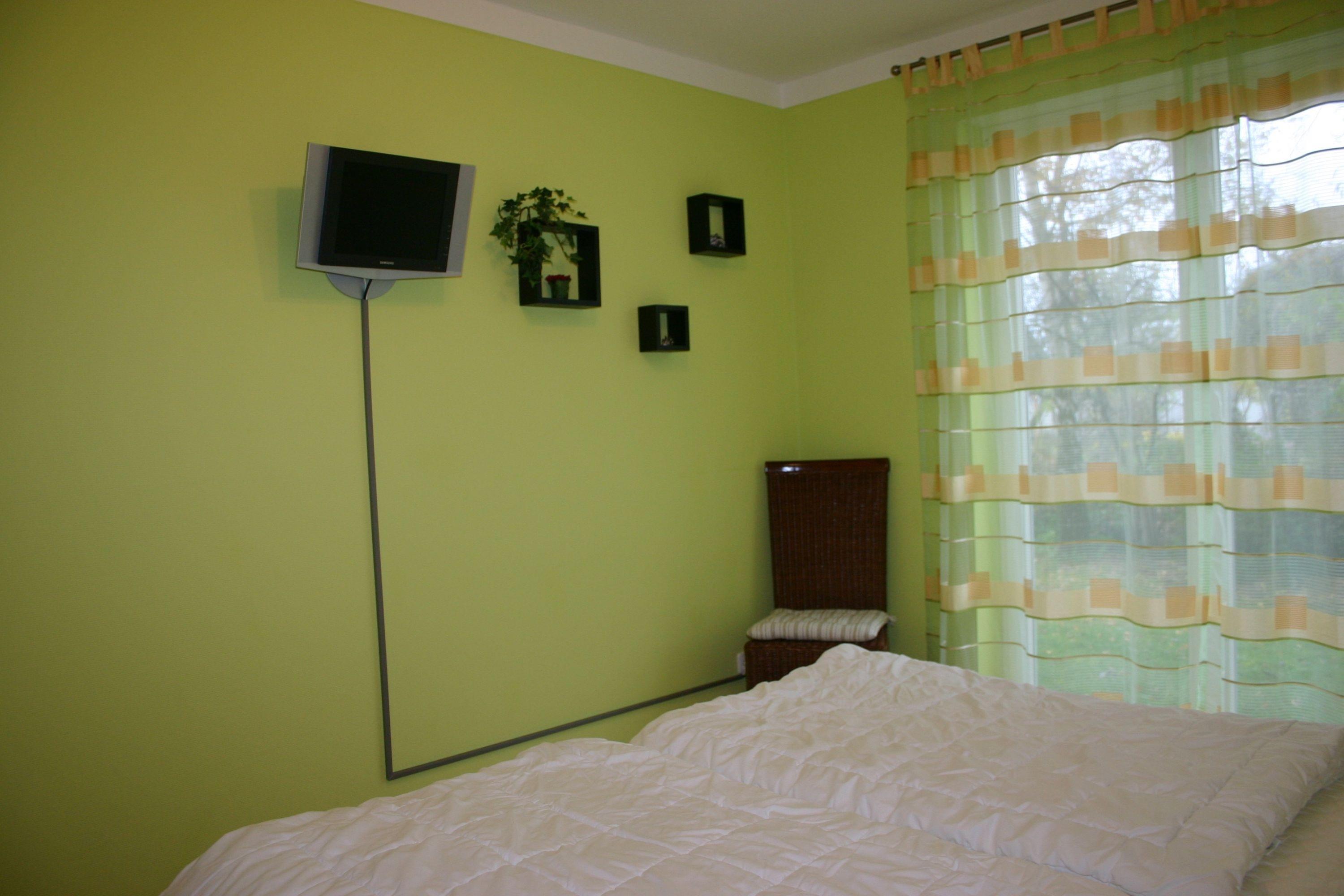 Das Schlafzimmer ist ausgestattet mit einem Doppelbett und TV. Im zweiten Schlafzimmer ist ein Rollbett. Ein Duschbad/WC ergänzt die Ferienwohnung.