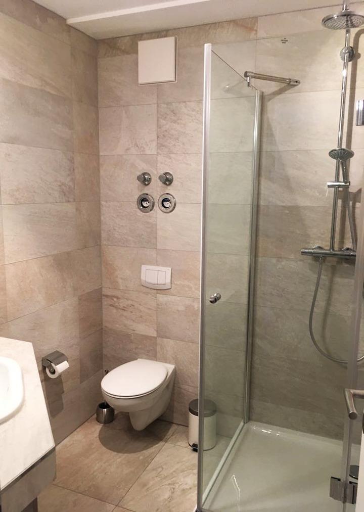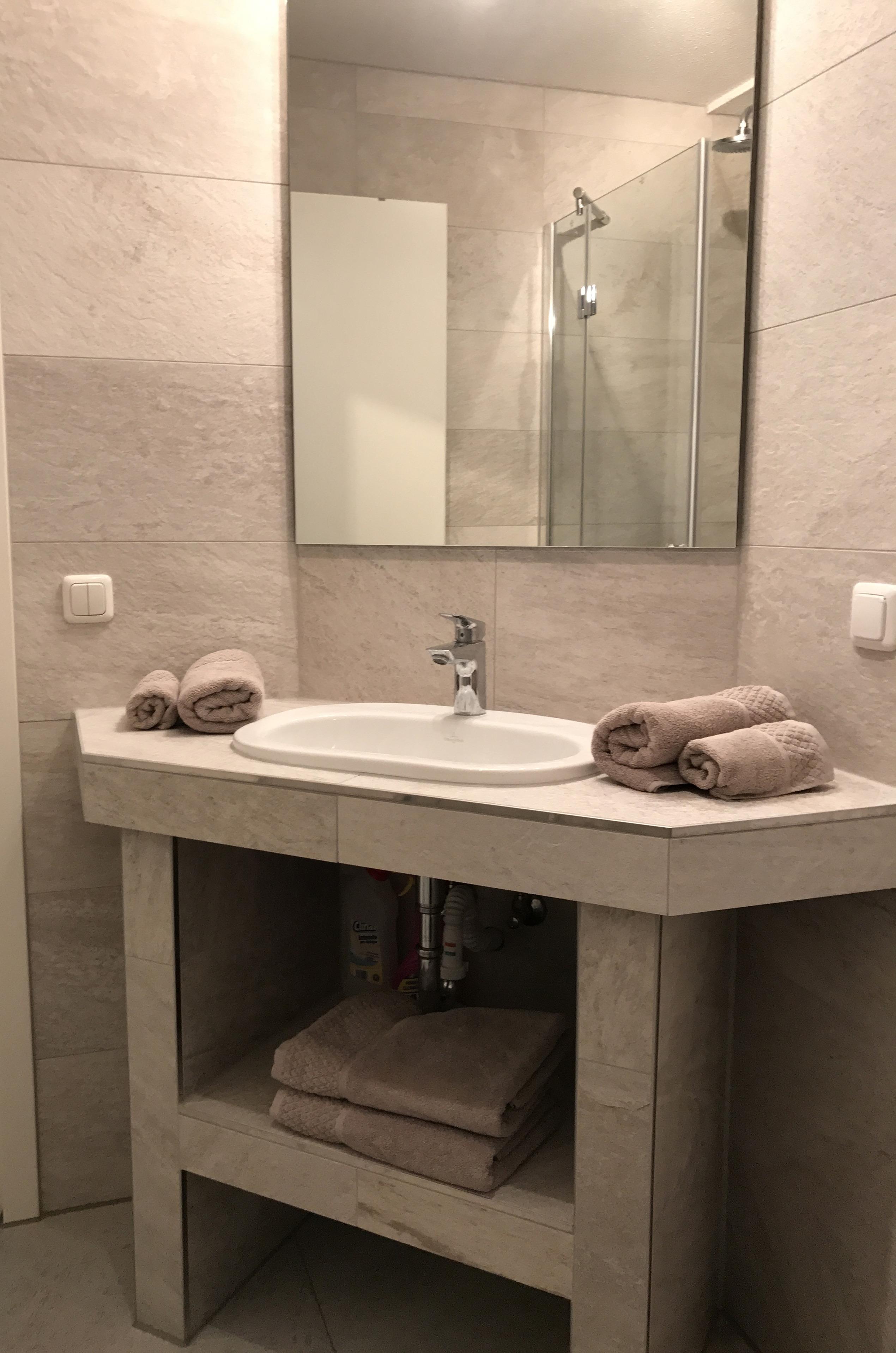 Das luxuriöse Bad ist mit einer Regendusche und modernsten Sanitärgegenständen ausgestattet und bietet Ihnen genügend Ablagefläche.