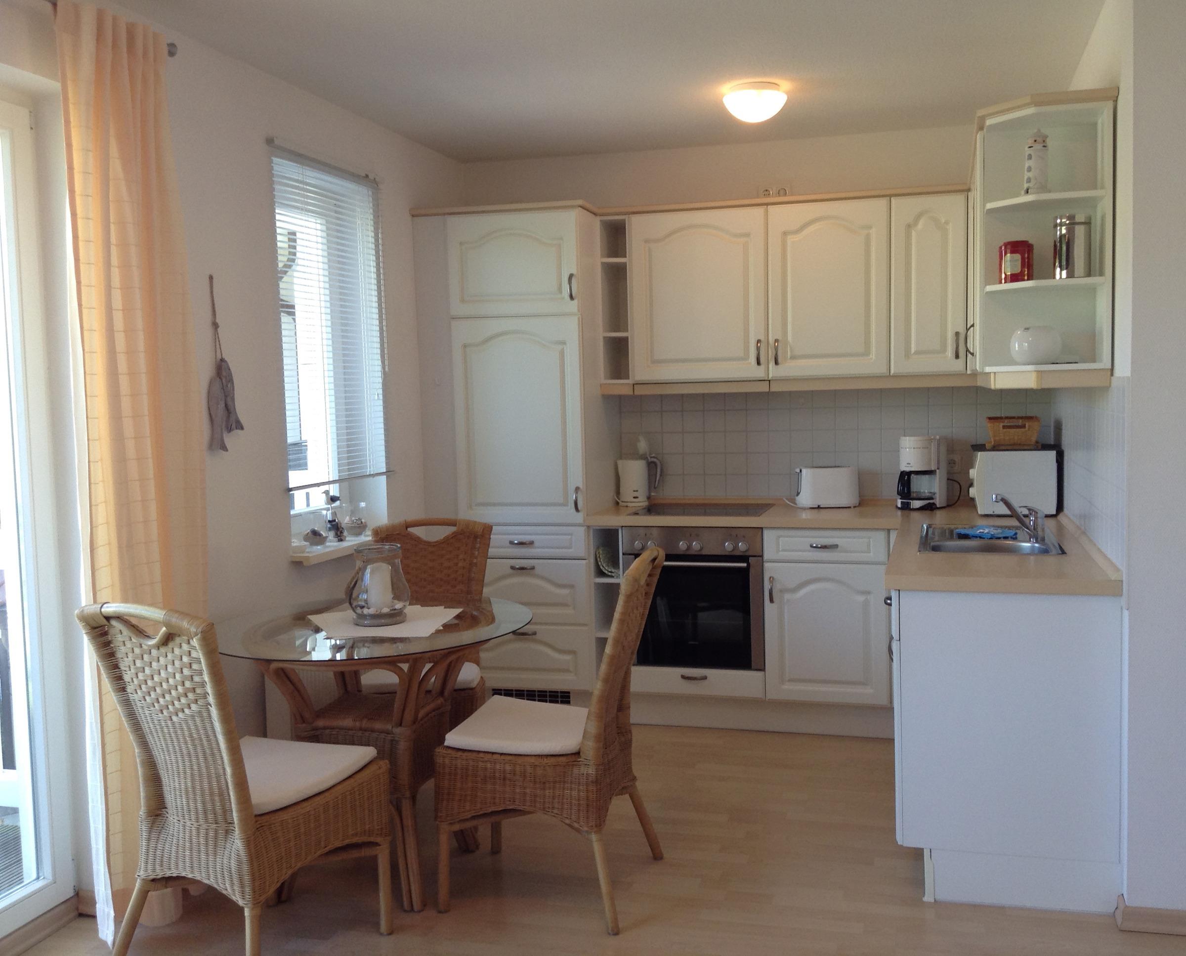 Die offene Landhausküche ist bestens ausgestattet mit Backofen, Cerankochfeld, Geschirrspüler und Mikrowelle.