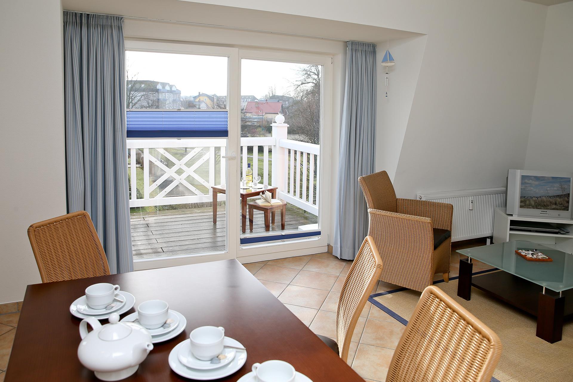 Der Wohnbereich bietet eine Sitzgruppe mit Doppelschlafcouch, Farb-TV, DVD-Player, Radio sowie W-LAN.