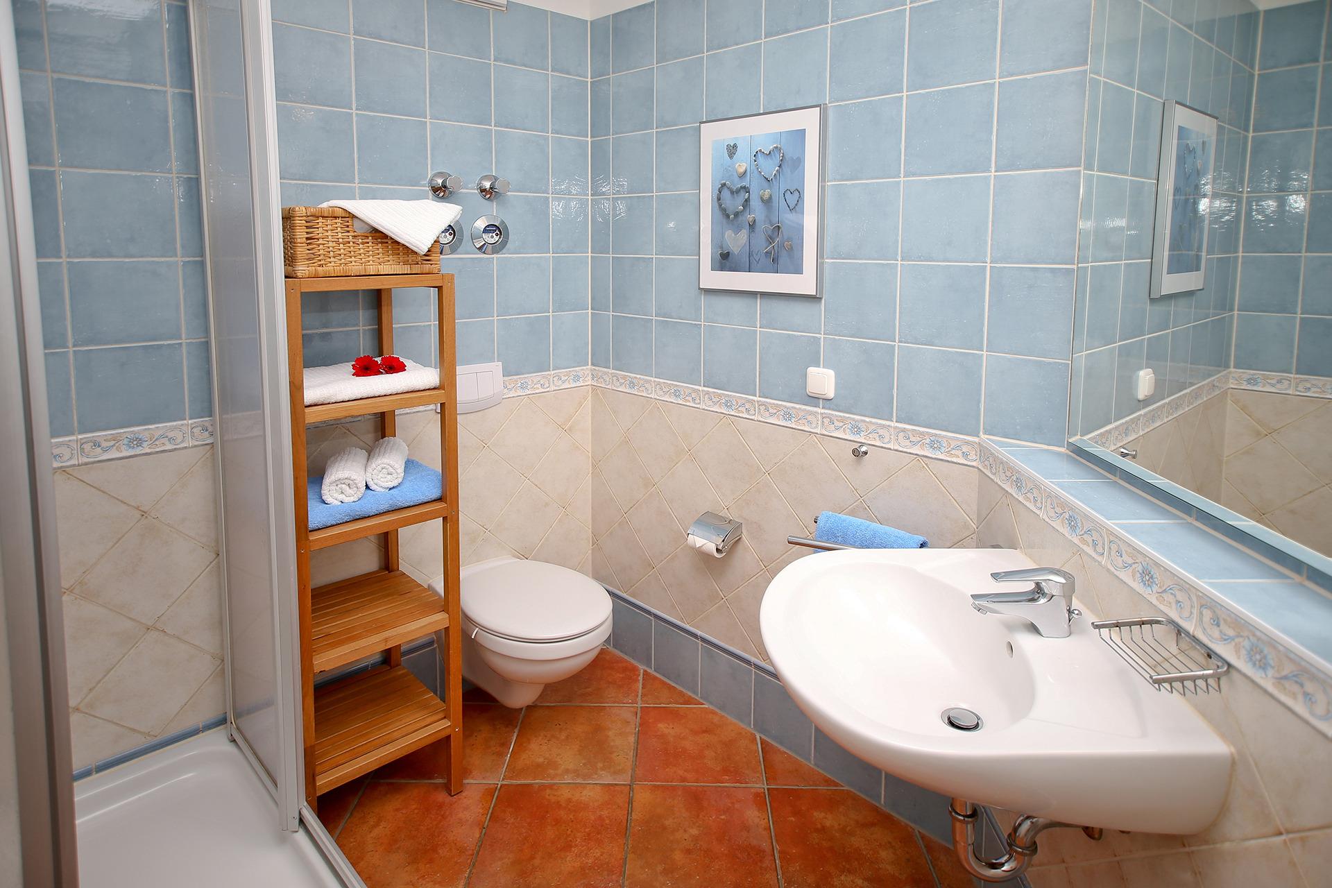 Der Wohnbereich ist gefliest, im Schlafzimmer ist Laminat verlegt. Ein Duschbad/WC ergänzt die Ferienwohnung.