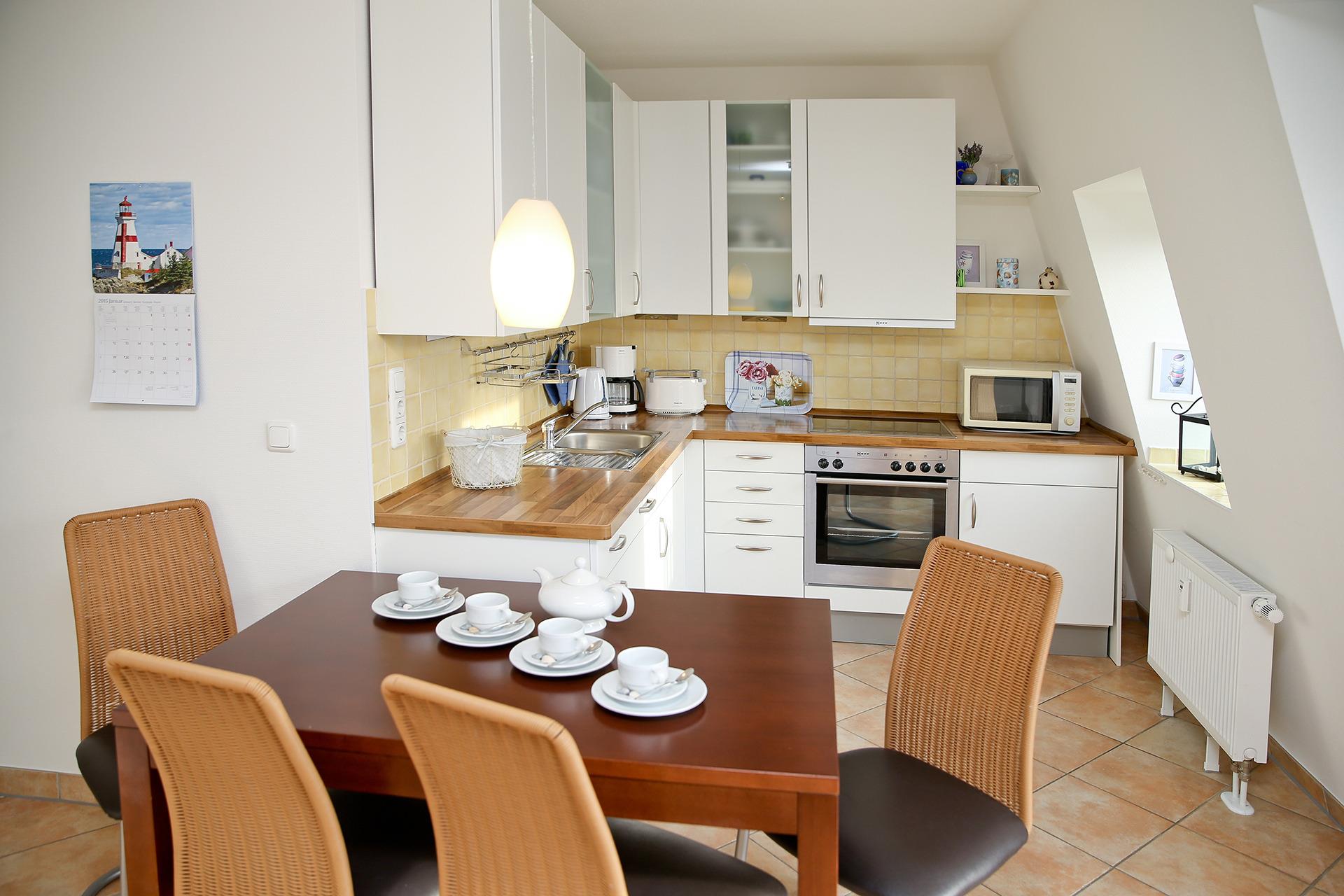 Die moderne Einbauküche mit Backofen, Geschirrspüler und Mikrowelle ist im Wohnbereich integriert.