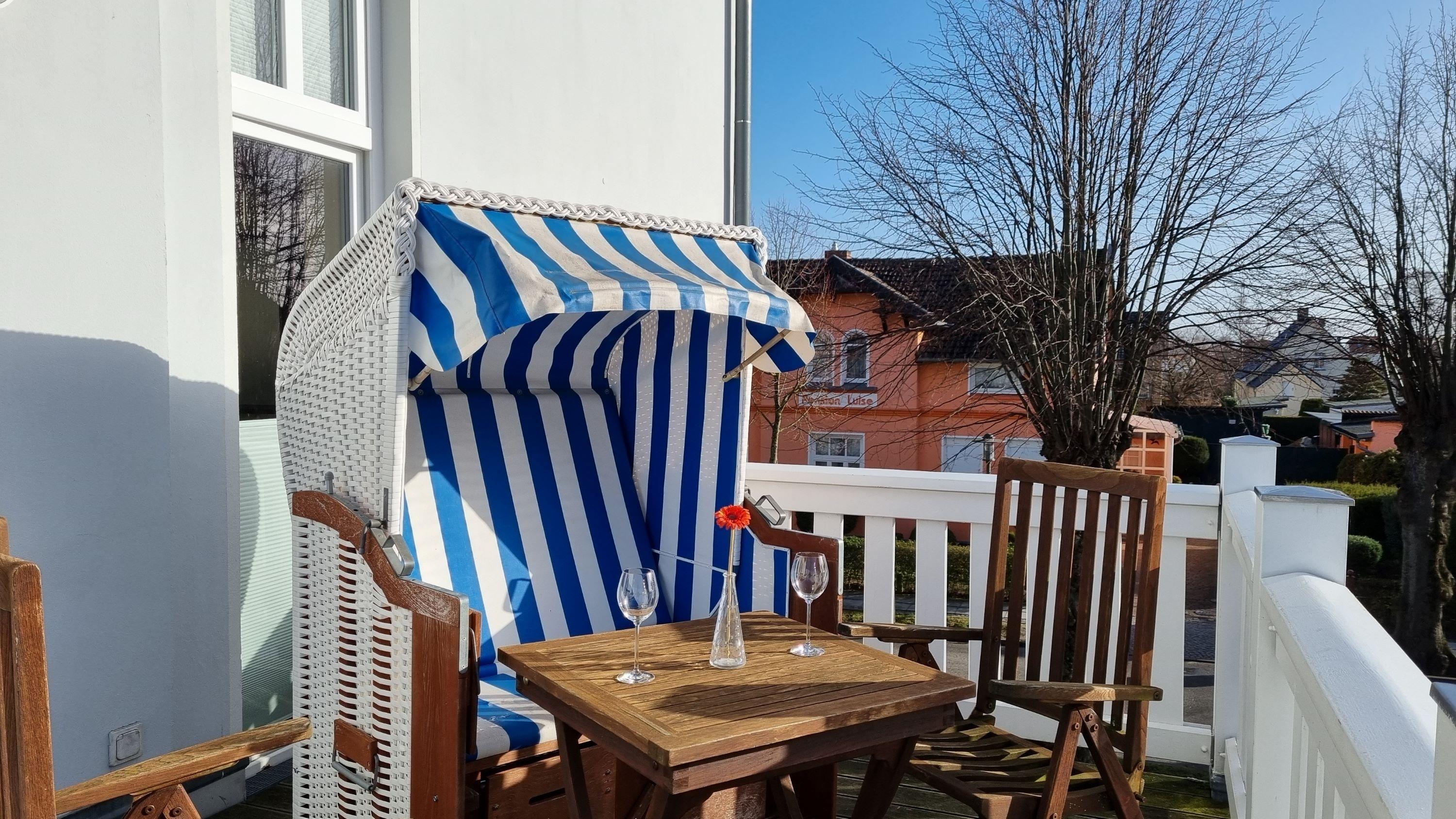 Der großzügige Balkon mit Strandkorb lädt zum Sonnenbaden ein.