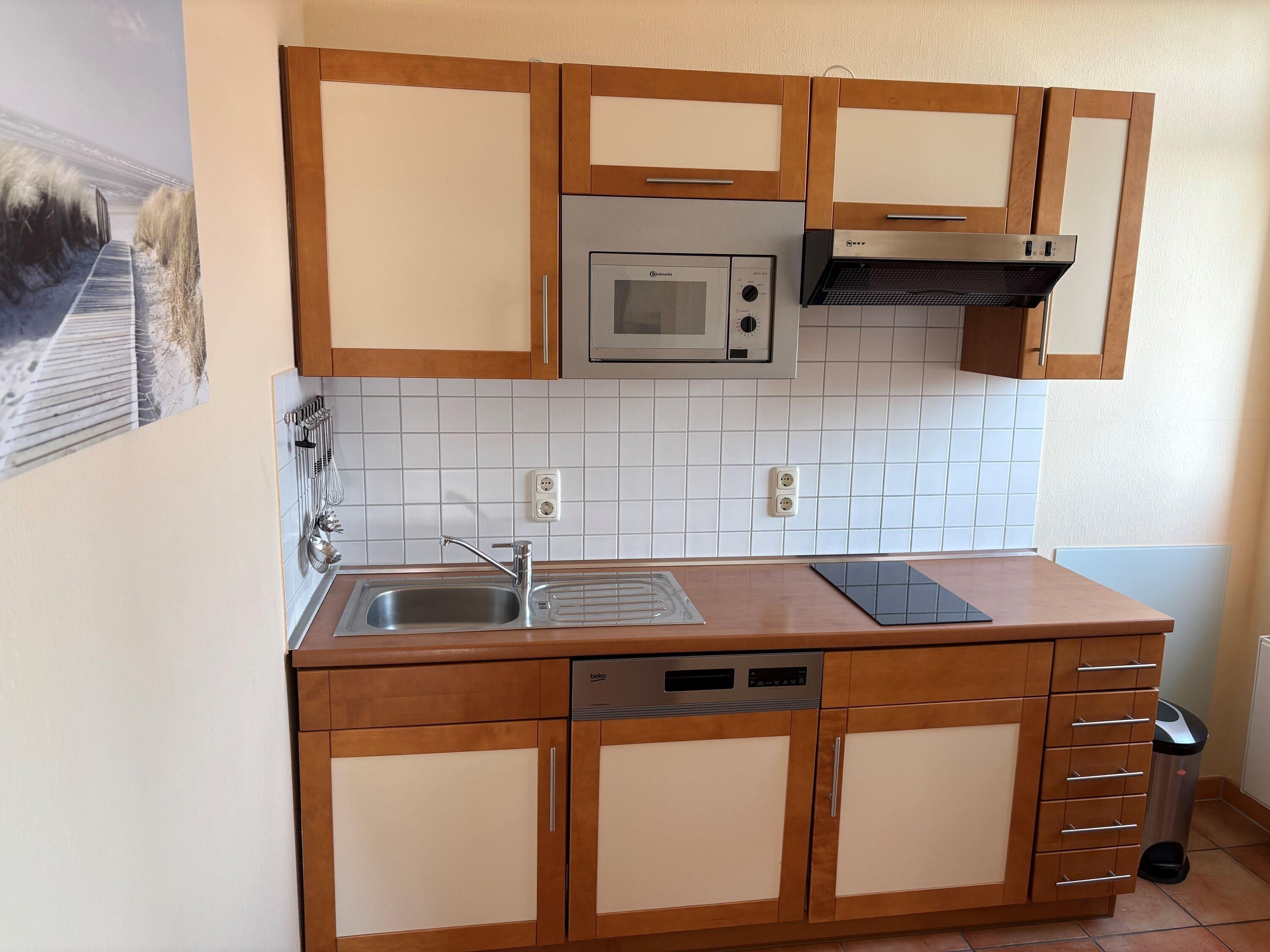 Die moderne Küche befindet sich separat jedoch offen zum Wohnbereich. Ausgestattet ist Sie mit Mikrowelle, Geschirrspüler, 2-Platten-Herd und Geschirrspüler..